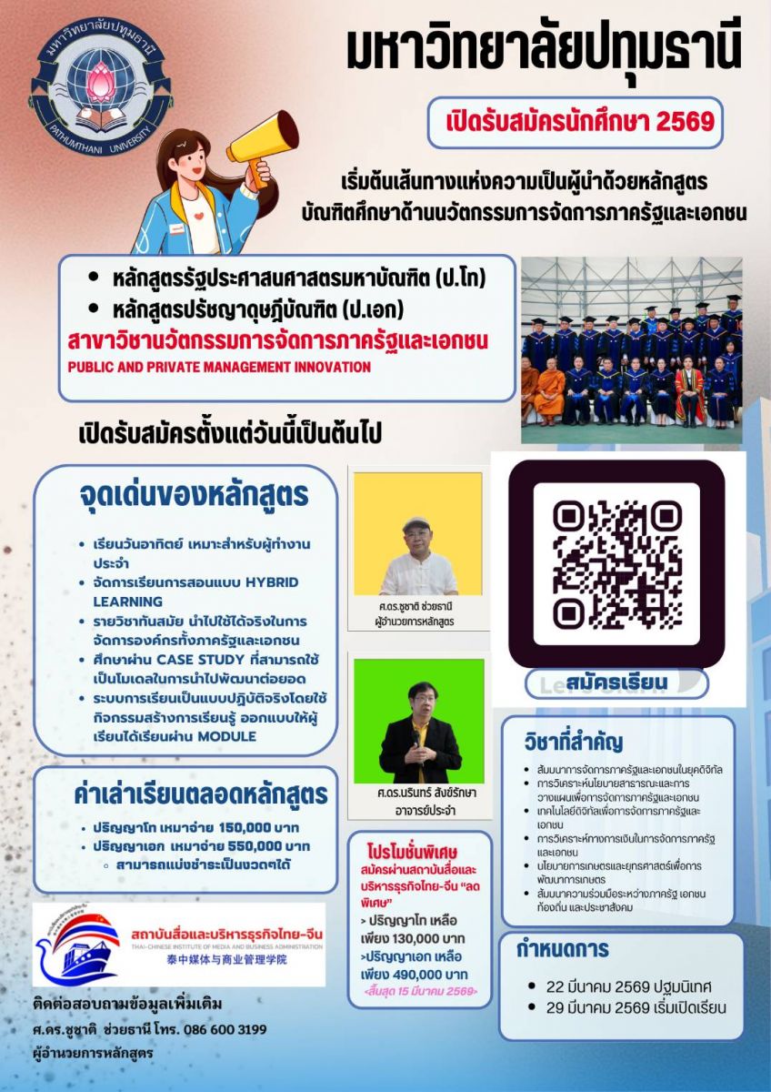 • หลักสูตรรัฐประศาสนศาสตรมหาบัณฑิต (รปศ. ปริญญาโท): รับส่วนลดทันที 20,000 บาท