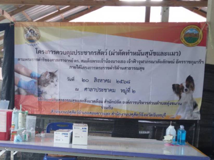 วันที่ 20 สิงหาคม 2568 เวลา 09.00 น. น.สพ.ธีร์ พูดเพราะ ปศุสัตว์จังหวัดจันทบุรี พร้อมสพ.ญ.ประภัสสร หยกยิ่งยง นายสัตวแพทย์ชำนาญการ กลุ่มพัฒนาสุขภาพสัตว์ และนายชุติเทพ ภูมิพันธุ์ รักษาราชการแทนปศุสัตว์อำเภอสอยดาว ร่วมกับองค์การบริหารส่วนตำบลทุ่งขนาน ดำเนินงานผ่าตัดทำหมันสุนัข-แมว จำนวน 60 ตัว โครงการป้องกันควบคุมโรคพิษสุนัขบ้า ตามโครงการควบคุมประชากรสัตว์(ผ่าตัดทำหมันสุนัขและแมว) ตามพระราชดำริของศาสตราจารย์ ดร.สมเด็จพระเจ้าน้องนางเธอ เจ้าฟ้าจุฬาภรณวลัยลักษณ์ อัครราชกุมารีฯ ภายใต้โครงการพระราชดำริ ด้านสาธารณสุข ณ หมู่บ้านซับตารี ตำบลทุ่งขนาน อำเภอสอยดาว จังหวัดจันทบุรี