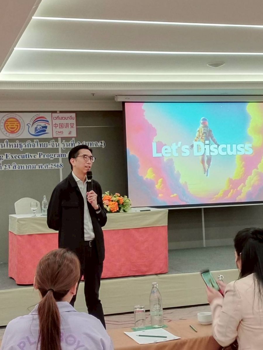 หลักสูตรผู้บริหารรุ่นใหม่ธุรกิจไทย-จีน รุ่นที่ 2 (Young Executive Program บทจ. 2) จัดการบรรยายและเสวนาหัวข้อ “AI and the Future Work” เมื่อวันที่ 23 สิงหาคม 2568 ณ โรงแรมดิ เอมเมอรัลด์ กรุงเทพฯ เพื่อให้ผู้เข้าร่วมเตรียมความพร้อมรับมือกับการเปลี่ยนแปลงในยุคปัญญาประดิษฐ์ โดยหลักสูตรนี้เกิดขึ้นจากความร่วมมือของสถาบันสื่อและบริหารธุรกิจไทย-จีน, สมาคมผู้สื่อข่าวไทย-จีน และหอการค้าไทย-จีน ซึ่งได้รับการสนับสนุนจากสถานเอกอัครราชทูตสาธารณรัฐประชาชนจีนประจำประเทศไทย และ China Media Group เพื่อขับเคลื่อนความสัมพันธ์อันดีระหว่างสองประเทศอย่างยั่งยืน