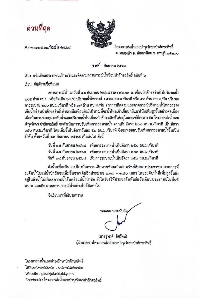 สถานการณ์น้ำ ล่าสุดวันนี้ โดยโครงการส่งน้ำและบำรุงรักษาป่าสักสิทธิ์ ได้ออกหนังสือ ด่วนที่สุด ลงวันที่ 17 กันยายน 2568 เรื่อง แจ้งเตือนประชาชนเฝ้าระวังและติดตามสถานการณ์น้ำเขื่อนป่าสักชลสิทธิ์ ฉบับที่ 6 เรื่อง แจ้งเตือนประชาชนเฝ้าระวังและติดตามสถานการณ์น้ำเขื่อนป่าสักชลสิทธิ์ ฉบับที่ 6 โครงการส่งน้ำและบำรุงรักษาป่าสักชลสิทธิ์ จะดำเนินการปรับเพิ่มการระบายน้ำ จากเดิมอัตรา 200 ลบ.ม./วินาที เป็นอัตรา 350 ลบ.ม./วินาที โดยเพิ่มขึ้นในอัตราวันละ 50 ลบ.ม./วินาที ซึ่งจะทยอยปรับเพิ่มการระบายน้ำขึ้นเป็นลำดับ ตั้งแต่วันที่ 17 ถึง 19 กันยายน 2568