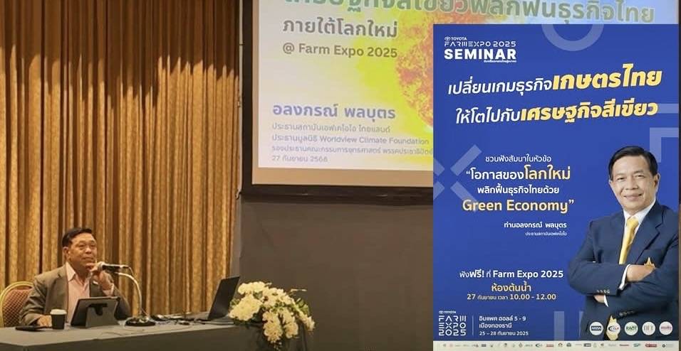 นายอลงกรณ์ พลบุตร ประธานสถาบันเอฟเคไอไอ.ไทยแลนด์ ประธานมูลนิธิ Worldview Climate Foundation บรรยายพิเศษในงานFarm Expo 2025 ที่อิมแพค เมืองทองฯ.เมื่อเร็วๆนี้ในหัวข้อม”เศรษฐกิจสีเขียว: พลิกฟื้นธุรกิจไทย ท่ามกลางโลกใหม่ที่เดือดระอุ“