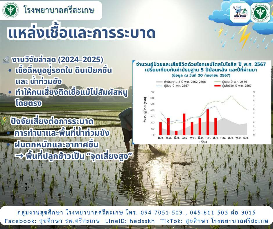 งานวิจัยใหม่ปี 2567-2568 ชี้ชัดว่าเชื้อสามารถอยู่ในน้ำท่วมขังราว 10% และดินชื้นประมาณ 23% นั่นหมายความว่าการติดเชื้อ ไม่ได้เกิดจากการเจอหนูเพียงครั้งเดียว แต่เป็นผลรวมของวิถีชีวิตและธรรมชาติรอบตัวเรา พื้นที่นาที่มีน้ำท่วมขังต่อเนื่อง โคลนชื้น และฝนตกหนัก จึงเป็น “จุดเสี่ยงสูง” ที่ทุกคนต้องระวัง