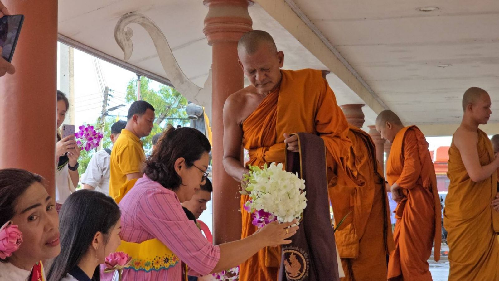 เมื่อเวลา 15.00 น.ของวันที่ 07 ตุลาคม 2568 ที่วัดเจ็ดริ้ว ต.เจ็ดริ้ว อ.บ้านแพ้ว จ.สมุทรสาคร นายชยพล รัตนวิสุทธิกุล นายอำเภอบ้านแพ้ว พร้อมด้วย นายปราโมทย์ ชาวเมืองโขง วัฒนธรรมจังหวัดสมุทรสาคร ผู้นำท้องที่ ผู้นำท้องถิ่น และชาวไทยเชื้อสายรามัญในพื้นที่ตำบลเจ็ดริ้ว ตลอดจนคณะครู นักเรียนนักศึกษา รวมถึงพี่น้องที่เป็นลูกหลานชาวไทยเชื้อสายรามัญในพื้นที่ใกล้เคียง ได้เข้าร่วมงานสืบสานประเพณีตักบาตรดอกไม้ – ล้างเท้าพระ เนื่องในวันออกพรรษา ประจำปี 2568 ซึ่งเป็นประเพณีและวัฒนธรรมดั้งเดิมของชาวไทยเชื้อสายรามัญในตำบลเจ็ดริ้ว ที่ได้ยึดถือปฏิบัติสืบต่อกันมาอย่างยาวนานกว่า 100 ปี โดยในปีนี้มีชาวไทยเชื้อสายรามัญตำบลเจ็ดริ้ว ได้มาร่วมกันทำบุญตักบาตรดอกไม้ ล้างเท้าพระกันเป็นจำนวนมาก ซึ่งการแต่งกายนั้น ส่วนใหญ่ก็จะนุ่งขาวห่มขาวและมีสไบมอญพาดไหล่ เป็นเอกลักษณ์การแต่งกายที่สำคัญของชาวมอญ(ชาวไทยรามัญ ต.เจ็ดริ้ว) ขณะที่ดอกไม้ที่นำมาตักบาตรใส่ย่ามพระภิกษุสงฆ์ส่วนใหญ่ก็จะเป็นดอกกล้วยไม้ ซึ่งเป็นดอกไม้เศรษฐกิจที่สำคัญในท้องถิ่น และมีความสวยงาม คงทน เหมาะแก่การนำไปบูชาพระ โดยบรรยากาศในปีนี้เมื่อพระภิกษุสงฆ์เดินผ่าน ทุกคนก็จะนำดอกไม้ที่เตรียมมาขึ้นบรรจบที่หน้าผากตั้งจิตอธิษฐานก่อนที่จะนำใส่ลงไปในย่ามของพระ และให้พระเหยียบบนผ้าที่ปูรองรับเท้า แล้วใช้น้ำที่บรรจุในภาชนะค่อยๆรดลงไปที่เท้าของพระเป็นการล้างเท้าทำความสะอาดให้กับท่าน ก่อนที่จะเข้าไปสวดมนต์เย็นในโบสถ์