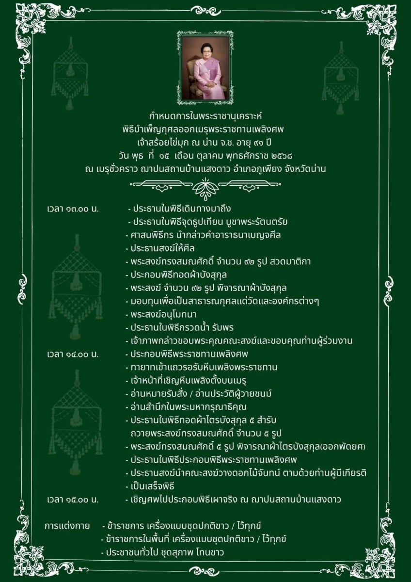 ทั้งนี้ กำหนดให้มีการบำเพ็ญกุศลศพระหว่างวันที่ 8–14 ตุลาคม 2568 ณ ศาลาหลวง วัดพระธาตุแช่แห้ง พระอารามหลวง โดยมีพิธีสวดพระอภิธรรมทุกวัน เวลา 19.00 น. และกำหนดพิธีพระราชทานเพลิงศพในวันที่ 15 ตุลาคม 2568 เวลา 13.00 น. ณ เมรุชั่วคราว ฌาปนสถานบ้านแสงดาว อำเภอภูเพียง จังหวัดน่าน