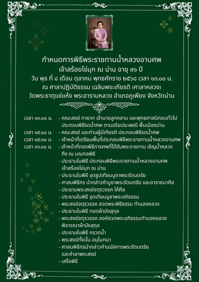 วันที่ 8 ตุลาคม 2568 ณ ศาลาหลวง วัดพระธาตุแช่แห้ง พระอารามหลวง อำเภอภูเพียง จังหวัดน่าน ได้ประกอบพิธีพระราชทานน้ำหลวงอาบศพ และพิธีบำเพ็ญกุศลศพ “เจ้าสร้อยไข่มุก ณ น่าน” อายุ 91 ปี มารดา พระราชนันทวัชรบัณฑิต รองเจ้าคณะจังหวัดน่าน