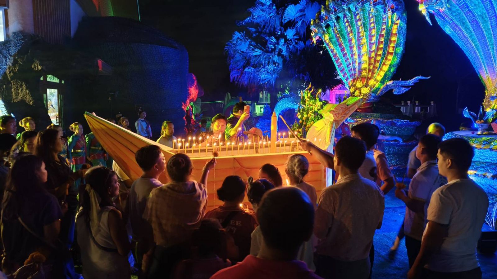เมื่อเร็วๆนี้ ที่วัดศรีสมบูรณ์รัตนาราม บ้านหนองแคน ต.สำโรง อ.อุทุมพรพิสัย จ.ศรีสะเกษ พระครูวินัยธรศักดิ์มนตรี ปภัสโร หรือหลวงปู่โชติ เจ้าอาวาสวัดศรีสมบูรณ์รัตนาราม นำศิษยานุศิษย์ พุทธศาสนิกชน และชาวบ้านในพื้นที่ ร่วมกันจัดงานพิธี “บูชาไฟพญานาค 15 ค่ำเดือน 11” และเปิดวังนาคินทร์หนองทิดแก้ว ถ้ำขุมทรัพย์นาคเศรษฐี ในช่วงเทศกาลวันออกพรรษา ประจำปี 2568 ขณะที่ชาวบ้านแห่ขอโชคลาภอย่างคึกคัก