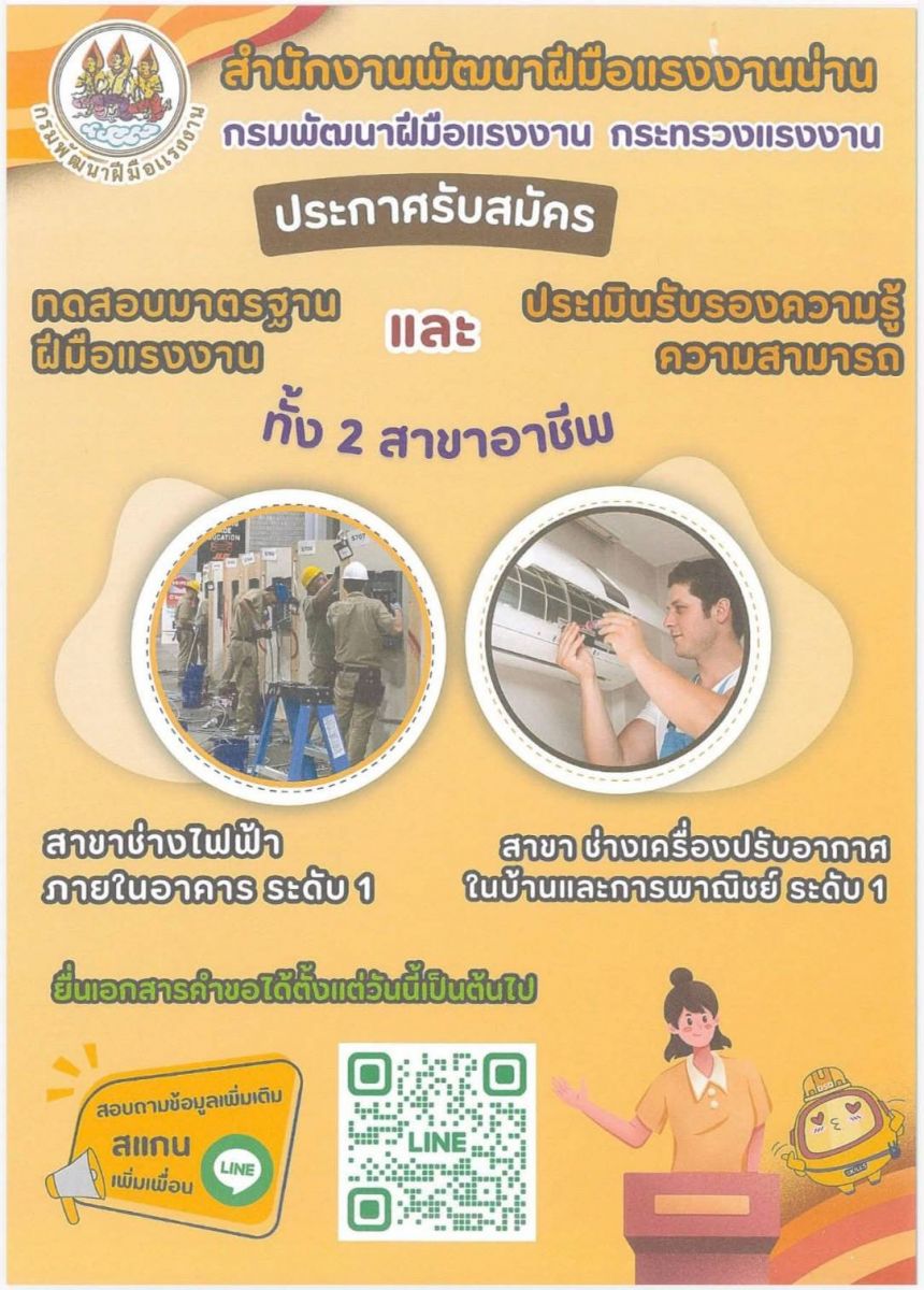 สำนักงานพัฒนาฝีมือแรงงานน่าน ขอเชิญผู้ประกอบอาชีพและผู้สนใจ เข้ารับการ ทดสอบมาตรฐานฝีมือแรงงานแห่งชาติ และ การประเมินรับรองความรู้ความสามารถ ประจำปีงบประมาณ 2569 ใน 2 สาขา ได้แก่