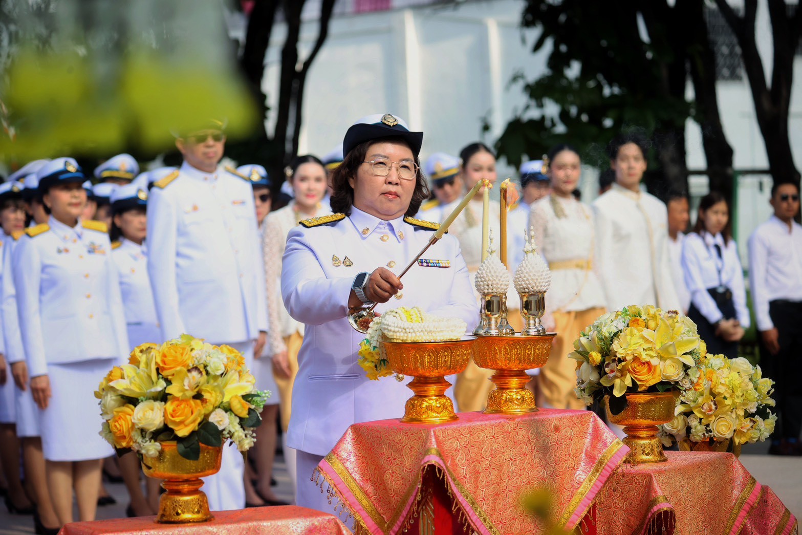 นางลภาวรรณ จันทร์กระจ่าง รองผู้อำนวยการธนาคารออมสิน รักษาการผู้อำนวยการธนาคารออมสิน นำคณะผู้บริหารและพนักงาน ร่วมพิธีวางพวงมาลาถวายสักการะเบื้องหน้าพระบรมฉายาลักษณ์ พระบาทสมเด็จพระบรมชนกาธิเบศร มหาภูมิพลอดุลยเดชมหาราช บรมนาถบพิตร