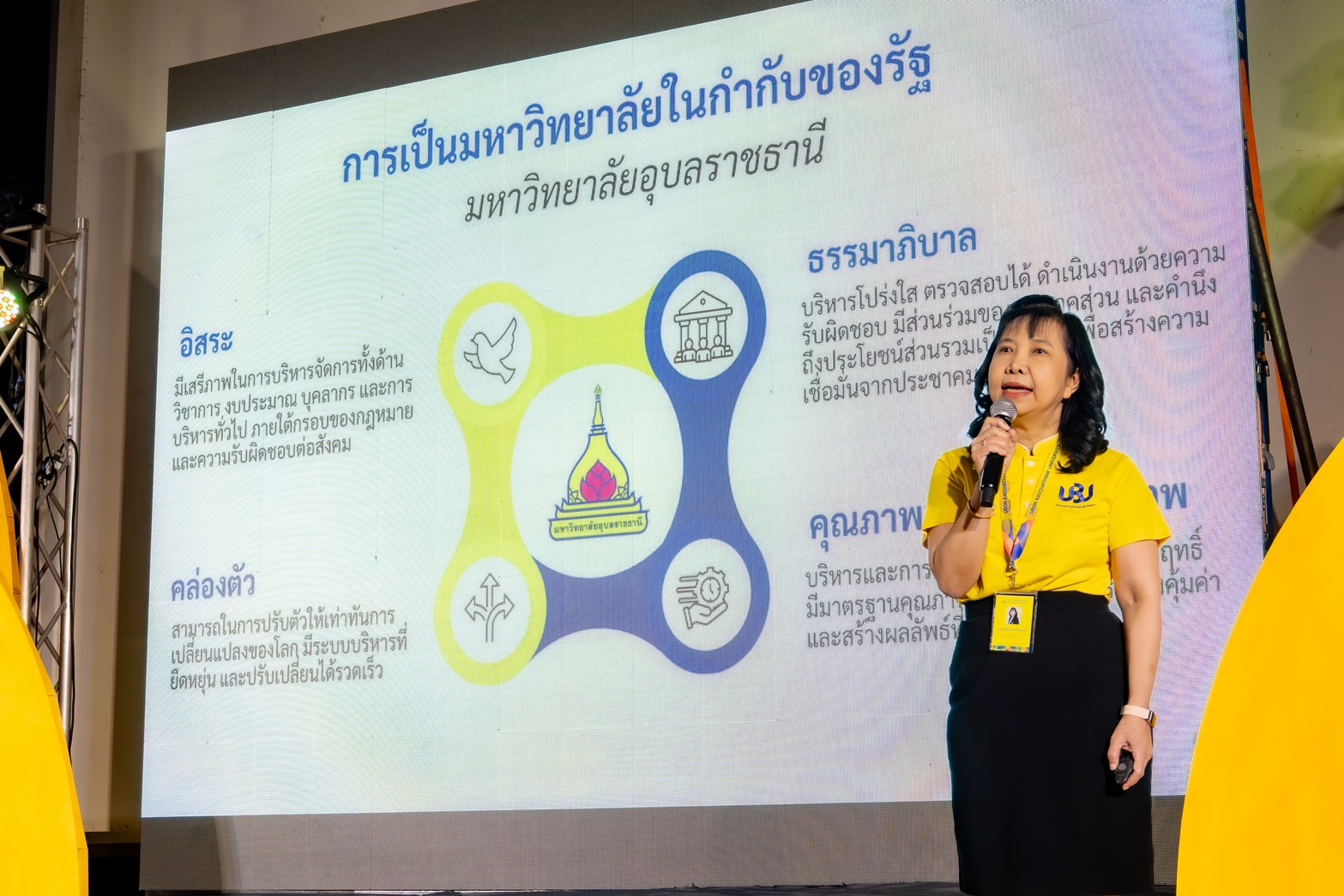 โอกาสอันสำคัญนี้ รองศาสตราจารย์ ดร.ชุตินันท์ ประสิทธิ์ภูริปรีชา อธิการบดี ได้กล่าวปาฐกถาพิเศษ “President’s Keynote: UBU Vision Forward” นำเสนอวิสัยทัศน์และแนวทางขับเคลื่อนมหาวิทยาลัยในยุคใหม่ ทิศทางสำคัญในการพัฒนามหาวิทยาลัย ทั้งการจัดตั้งคณะและหลักสูตรใหม่ให้สอดคล้องกับความต้องการของสังคมในอนาคต การปรับผังแม่บทมหาวิทยาลัยเพื่อรองรับการขยายตัวทางกายภาพและการบริหารจัดการพื้นที่อย่างมีประสิทธิภาพ การพัฒนานวัตกรรมการเรียนรู้ให้ทันต่อการเปลี่ยนแปลงของเทคโนโลยี และการสร้างระบบนิเวศเศรษฐกิจฐานความรู้ โดยเฉพาะการจัดตั้ง หน่วยวิสาหกิจของมหาวิทยาลัย และบริษัท UBU Holding Company เพื่อเพิ่มขีดความสามารถในการแข่งขันขององค์กร สร้างความเข้มแข็งทางเศรษฐกิจ และวางรากฐานสู่ความมั่นคงทางการเงินในระยะยาวของมหาวิทยาลัยอุบลราชธานี อีกด้วยนอกจากนี้ ยังมีการนำเสนอวิดีทัศน์ “Voices of the Future” ถ่ายทอดมุมมองจากนักศึกษาและบุคลากร สะท้อนความร่วมแรงร่วมใจในการร่วมสร้างอนาคตของมหาวิทยาลัย ก่อนเข้าสู่ช่วงสำคัญของงาน โดยอธิการบดีนำคณะผู้บริหารร่วมกัน “Kick Off” สู่การเป็นมหาวิทยาลัยในกำกับของรัฐอย่างเป็นทางการ พร้อมการแสดงพิเศษจากผู้บริหาร คณาจารย์ บุคลากร และนักศึกษา ในบรรยากาศแห่งความภาคภูมิใจ อบอุ่นใจ เสริมสร้างความรักและความสามัคคี รวมกันเป็นหนึ่งสะท้อนถึง “พลังแห่งการร่วมสร้างอนาคต” ภายใต้ค่านิยม UBU – ทำเพื่อมหาวิทยาลัยร่วมกัน เพื่อก้าวสู่ยุคใหม่ของมหาวิทยาลัยอุบลราชธานี อย่างมั่นคงและยั่งยืน