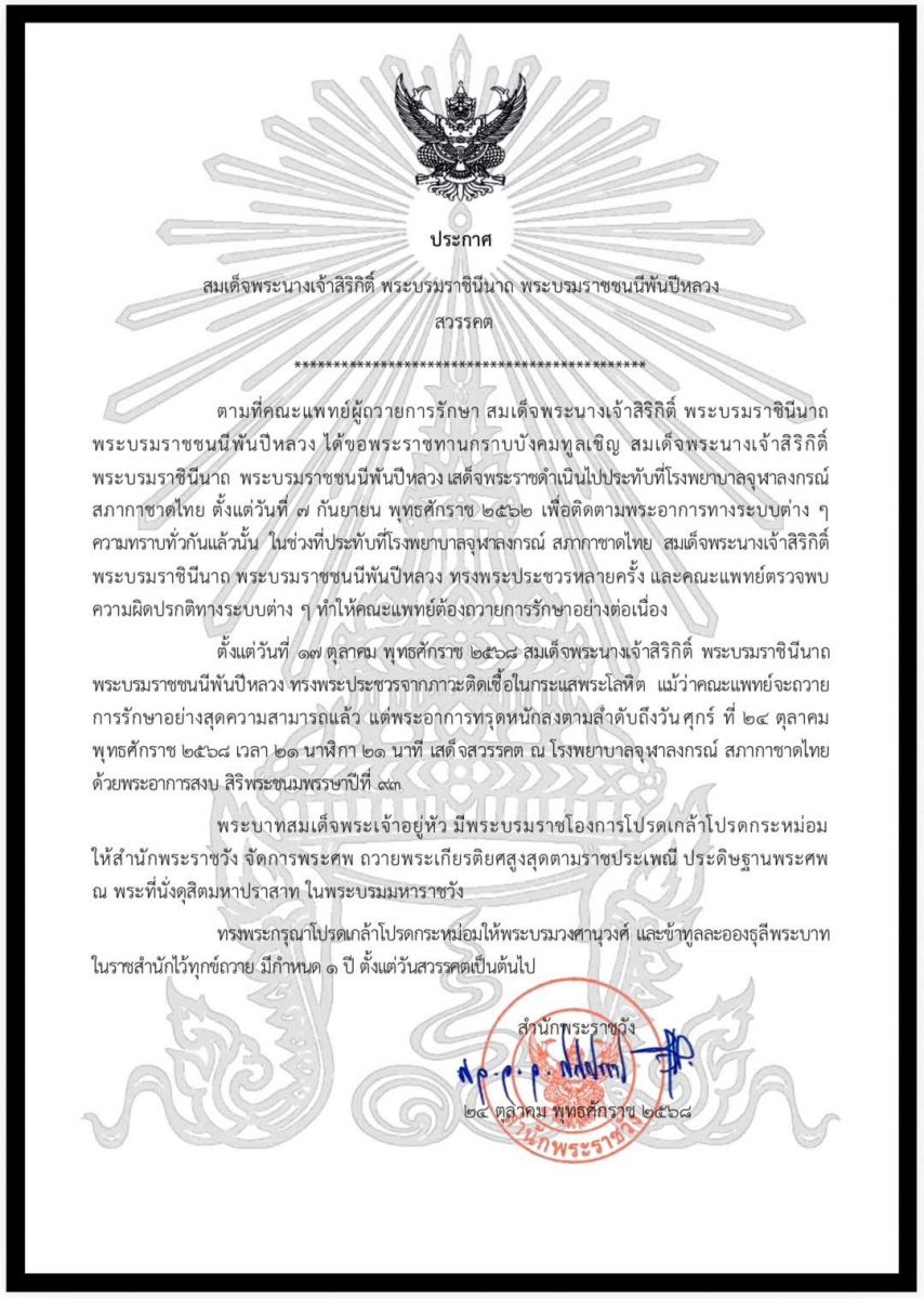 ประกาศสำนักพระราชวัง สมเด็จพระนางเจ้าสิริกิติ์ พระบรมราชินีนาถ พระบรมราชชนนีพันปีหลวงสวรรคต ธ สถิตในดวงใจไทยนิรันดร์ ๒๔ ตุลาคม ๒๕๖๘