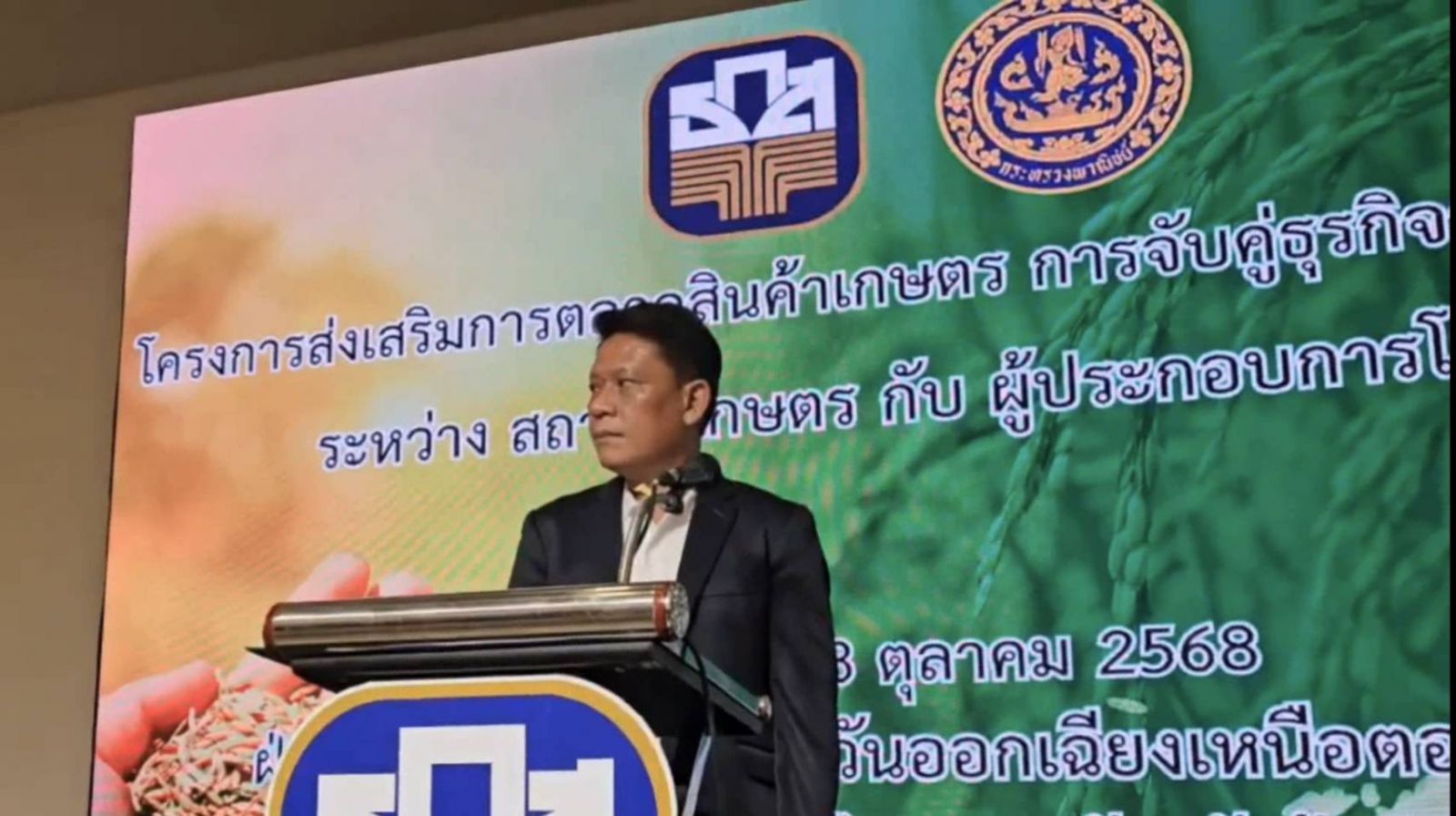 นายวุฒิพงศ์ เกษสัญชัย ผู้อํานวยการฝ่ายกิจการสาขาภาคตะวันออกเฉียงเหนือตอนบน กล่าวรายงานรายละเอียดของโครงการ ซึ่งมี ผู้บริหาร ธ.ก.ส. ภาครัฐ ภาคเอกชน และสถาบันเกษตรกร ภาคอีสานเข้าร่วมในพิธี ของโครงการ ตามเป้าหมาย ของโครงการที่มีวัตถุประสงค์ เพื่อส่งเสริมช่องทางการตลาด และสร้างความร่วมมือระหว่างสถาบันเกษตรกรกับภาคเอกชนผู้ประกอบการโรงสีข้าวให้เกิดการแลกเปลี่ยน ข้อมูล ความรู้ และการเจรจาธุรกิจอย่างมีประสิทธิภาพ เพื่อยกระดับคุณภาพ และมูลค่าข้าวไทย รวมถึงเสริมสร้างความเข้มแข็งให้แก่ระบบเศรษฐกิจฐานราก