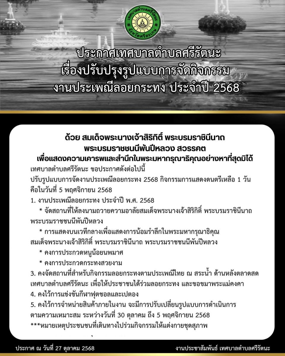 นายกเทศมนตรีตำบลศรีรัตนะ อ.ศรีรัตนะ จ.ศรีสะเกษ เปิดเผยว่า การจัดงานประเพณีลอยกระทง ประจำปี 2568 ในครั้งนี้ ทางเทศบาลตำบลศรีรัตนะ ได้ดำเนินการปรับรูปแบบการจ้ดงานและรักษางานประเพณีลอยกระทง เป็นภูมิปัญญาอันงดงามที่สืบทอดกันมายาวนาน เพื่อแสดงถึงความกตัญญูต่อพระแม่คงคา ผู้หล่อเลี้ยงสรรพชีวิต และเพื่อสืบสานวัฒนธรรมไทยให้คงอยู่คู่แผ่นดินสืบไป