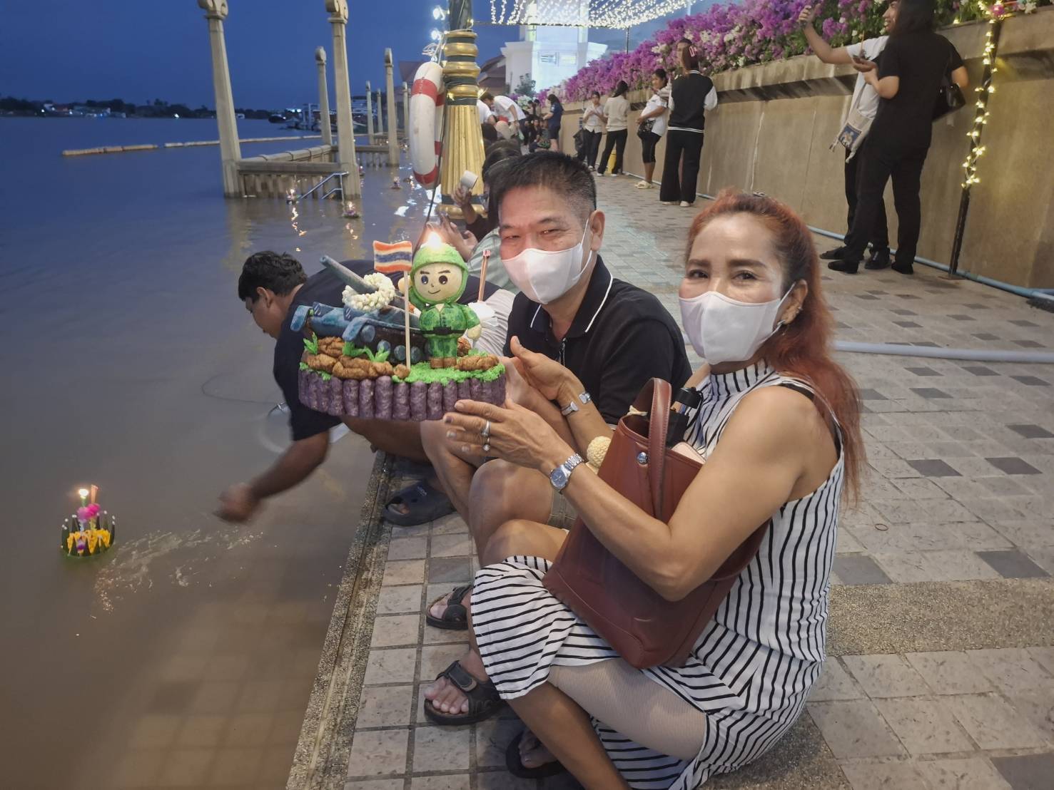 พร้อมกันที่บริเวณท่าน้ำริมเขื่อนเจ้าพระยา ประชาชน นักเรียน นักศึกษา จำนวนมากเดินทางมาร่วมงานลอยกระทงกันอย่างคึกคัก นอกจากนี้ยังพบว่ามีสามีภรรยาคู่หนึ่ง ได้นำกระทงขนมปังซึ่งปั้นเป็นรูปของทหารและรถถังพร้อมธงชาติไทย มาทำการลอยกระทงพร้อมตั้งจิตอธิษฐานขออวยพรให้กับทหารกล้าที่อยู่แนวชายแดนกำลังรักษาปกป้องอธิปไตยอยู่นั้น ให้มีความสุขและแคล้วคลาดปลอดภัย