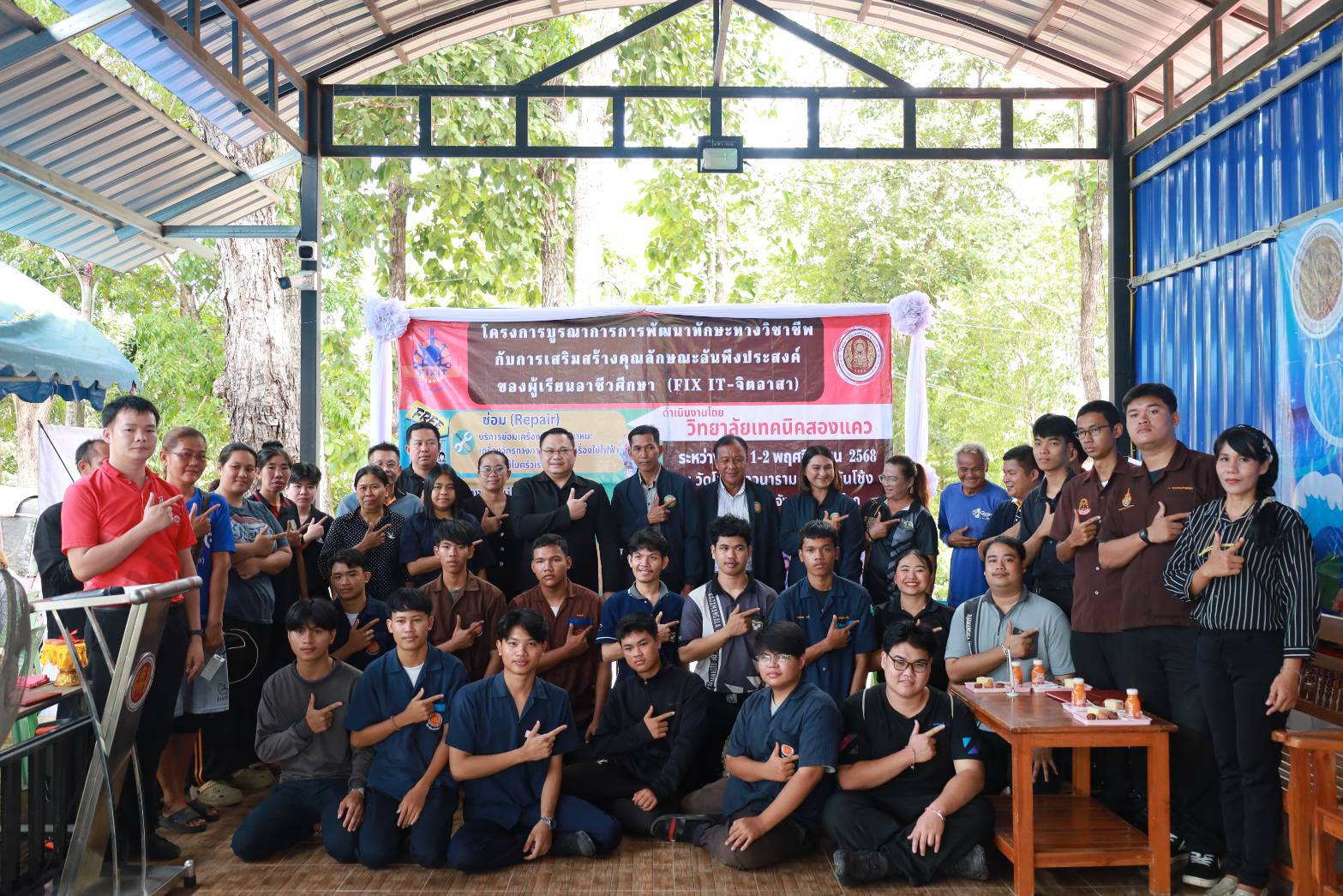 เมื่อเวลา 10.00 น วันที่ 6 พฤศจิกายน 2568 ที่วัดโป่งแควนาราม ตำบลคันโช้ง อำเภอวัดโบสถ์ จังหวัดพิษณุโลก วิทยาลัยเทคนิคสองแคว พิษณุโลก นายณัฐวุฒิ หงษา หัวหน้างานโครงการพิเศษและการบริการชุมชน ได้จัดโครงการบูรณาการการพัฒนาทักษะทางวิชาชีพ กับการเสริมสร้างคุณลักษณะอันพึงประสงค์ของผู้เรียนอาชีวศึกษา Fix it - จิตอาสา ช่วยเหลือผู้ประสบภัยน้ำท่วม โดยมี นายสำเริง แก้ววิเศษ รองนายกองค์การบริหารส่วนตำบลคันโช้ง ให้การต้อนรับ