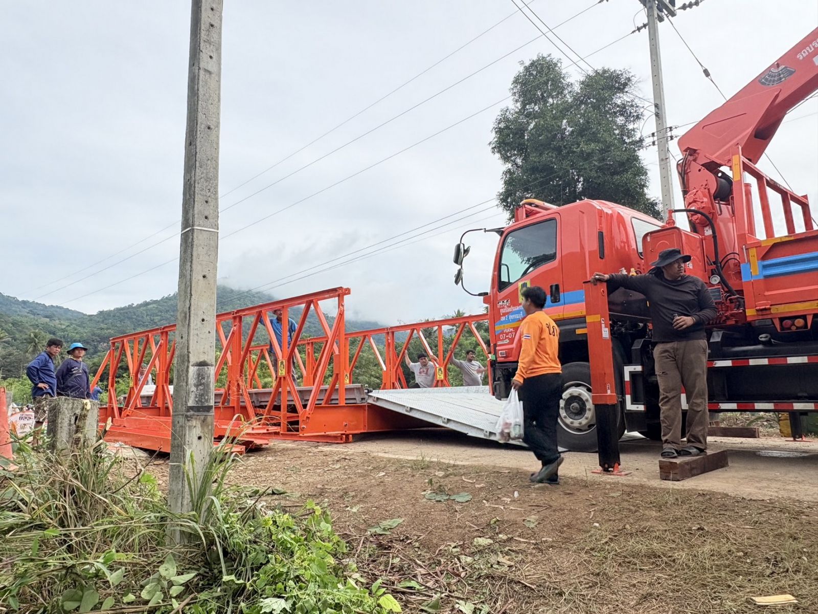 โดยเมื่อวันที่ 6 พ.ย.68 เจ้าหน้าที่ศูนย์ป้องกันและบรรเทาสาธารณภัย เขต 2 สุพรรณบุรี ได้นำเครื่องจักรขนาดใหญ่เข้ามาติดตั้งสะพานแบริ่งเพื่อบรรเทาความเดือดร้อนให้กับประชาชนในพื้นที่เป็นการชั่วคราว โดยมีเจ้าหน้าที่เทศบาลตำบลเขาโจด เจ้าหน้าที่อุทยานแห่งชาติเขื่อนศรีนครินทร์ และชาวบ้านในพื้นที่ร่วมด้วยช่วยกันประกอบสะพาน จนกระทั่งเวลาประมาณ 14.00 น วันที่ 7 พ.ย.68 จึงสามารถประกอบสะพานแบริ่งให้ชาวบ้านใช้สัญจรไปมาได้อย่างสมบูรณ์แบบ แต่จำกัดด้วยการห้ามนำรถบรรทุกตั้งแต่ 6 ล้อขึ้นไปข้ามสะพานโดยเด็ดขาด เพราะสะพานแบริ่งสามารถรับน้ำหนักไม่เกิน 10 ตัน