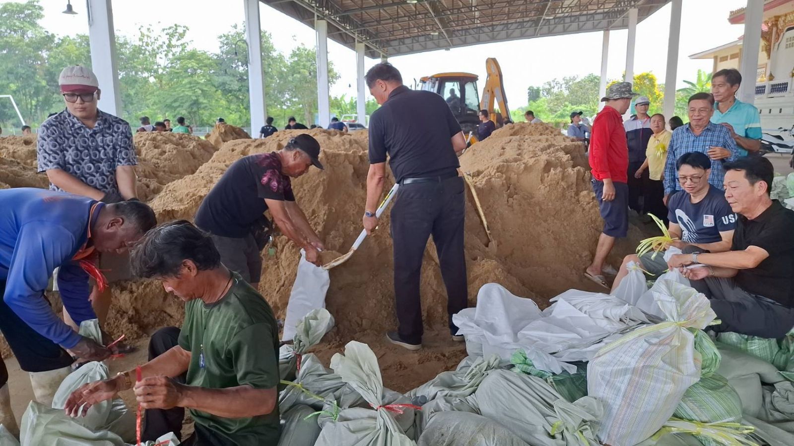 พร้อมกันนี่ที่วัดบางกะดี ต.บางกะดี ทางเจ้าหน้าที่เทศบาลเมืองบางกะดี พร้อมประชาชนที่มีจิตอาสา รวมทั้งชาวบ้านที่อาศัยอยู่ในพื้นที่ ได้ช่วยกันกรอกกระสอบทราย เพื่อสำหรับเตรียมความพร้อมเนื่องจากพบว่าระดับน้ำในช่วงเช้าที่ผ่านมา ระดับน้ำสูงขึ้นมีปริมาณน้ำไหลเข้าท่วมในหลายพื้นที่