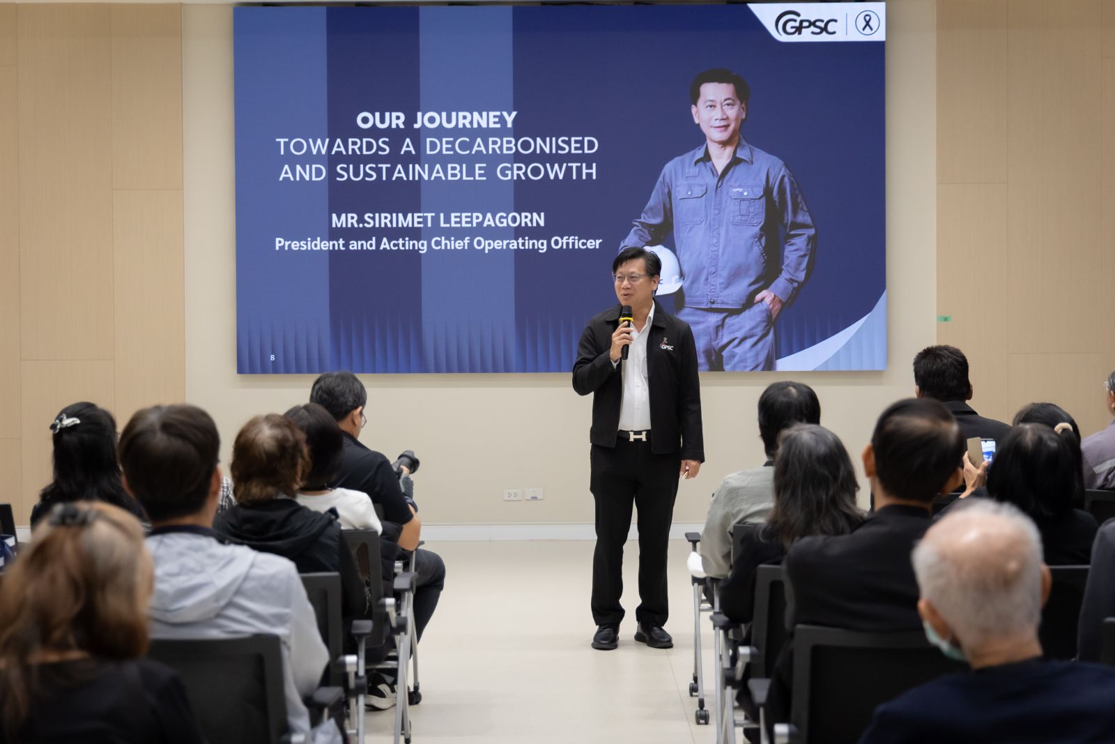 นายศิริเมธ ลี้ภากรณ์ ผู้จัดการใหญ่และรักษาการประธานเจ้าหน้าที่ปฏิบัติการ บริษัท โกลบอล เพาเวอร์ ซินเนอร์ยี่ จำกัด (มหาชน) หรือ GPSC แกนนำนวัตกรรมธุรกิจไฟฟ้าและพลังงานอัจฉริยะของกลุ่ม ปตท. ให้การต้อนรับกลุ่มผู้ถือหุ้นที่เข้าร่วมโครงการเยี่ยมชมกิจการประจำปี 2568 (SHD Site Visit 2025) ณ ศูนย์ผลิตสาธารณูปการแห่งที่ 2 จังหวัดระยอง