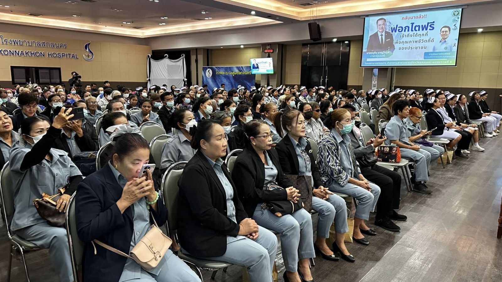 วันที่ 19 พฤศจิกายน 2568 ที่โรงพยาบาลศูนย์สกลนคร ได้จัดงานสัปดาห์โรคไต ฟอกไตฟรี ปลูกถ่ายไตฟรี เข้าถึงทุกที่เพื่อคุณภาพชีวิตที่ดีของพี่น้องชาวสกลนคร โดยมี นพ.พรพัฒน์ ภูนากลม นายแพทย์สาธารณสุขจังหวัดสกลนคร ร่วมกับ นพ.สมศักดิ์ ประฏิภาณวัตร ผู้อำนายการโรงพยาบาลสกลนคร ภายในงานมีการให้ความรู้เรื่องโครงการฟอกไตฟรี ในการล้างไตทางช่องท้องและการฟอกเลือดด้วยเครื่องไตเทียม โดยแพทย์หญิงวรรณพร อึ้งสกุล อายุรแพทย์โรคไต โรงพยาบาลสกลนคร นอกจากนี้ยังมีการเสวนาแลกเปลี่ยนประสบการณ์การล้างไตทางช่องท้อง การฟอกเลือดด้วยเครื่องไตเทียม โดยผู้ป่วยที่ทำการการล้างไตในแต่ละรูปแบบ สร้างความรู้ความเข้าใจการการประคับประคองการทำงานของไต และตระหนักถึงการใช้ชีวิตประจำวันในการควบคุมอาหาร หวาน มัน เค็ม ซึ่งเป็นปัจจัยเสี่ยงทำให้ป่วยโรคไต