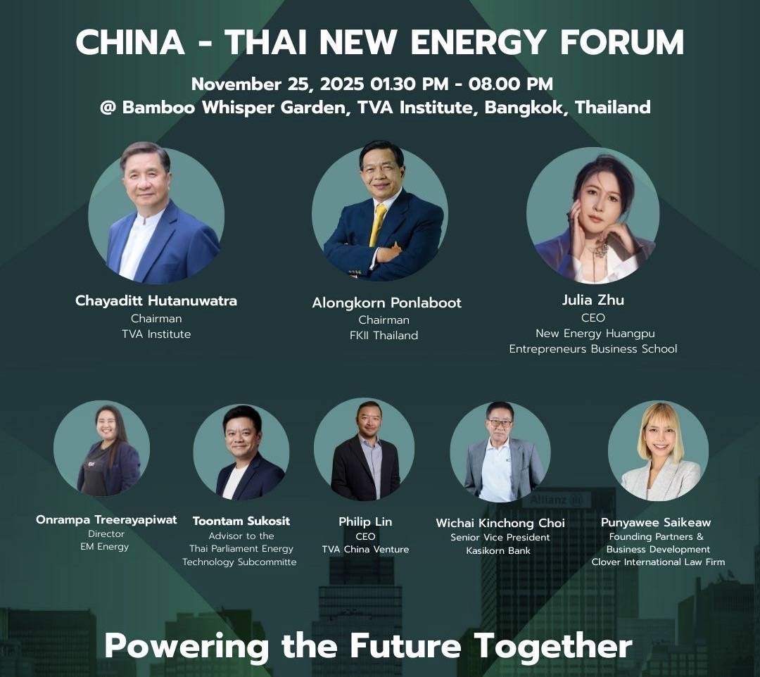 “ประเทศจีนพัฒนาก้าวหน้าทางด้านเทคโนโลยีอุตสาหกรรมพลังงานใหม่อย่างมากโดยมีบริษัทชั้นนำระดับโลกที่มีความเชื่อมั่นที่จะร่วมลงทุนและประกอบธุรกิจในประเทศไทยในสาขาต่างๆเช่น ยานยนต์ไฟฟ้า(EV) โซเดียมแบตเตอรี่โซล่าเซลล์ เทคโนโลยีประหยัดพลังงานอัจฉริยะเทคโนโลยี Fuel Cell พลังงานไฮโดรเจน ระบบกักเก็บพลังงานแบตเตอรี่(BESS) ลิเธียมแบตเตอรี่ เซมิคอนดักเตอร์ Biofuel SAF Nanoscience&Nanomanufacturing รีไซเคิลแบตเตอรี่ Wet Electronic Hazardous Waste Thermal Field Intelligent Control ฯลฯโดยการนำของสถาบัน New Energy Huangpu (ประเทศจีน) ซึ่งได้ตกลงความร่วมมือกับเอฟเคไอไอ.และสถาบันทิวาเพื่อส่งเสริมการลงทุนการถ่ายทอดเทคโนโลยีและการพัฒนาบุคคลากรด้านพลังงานใหม่ระหว่าง2ประเทศในวาระ50ปีความสัมพันธ์ไทย-จีน“