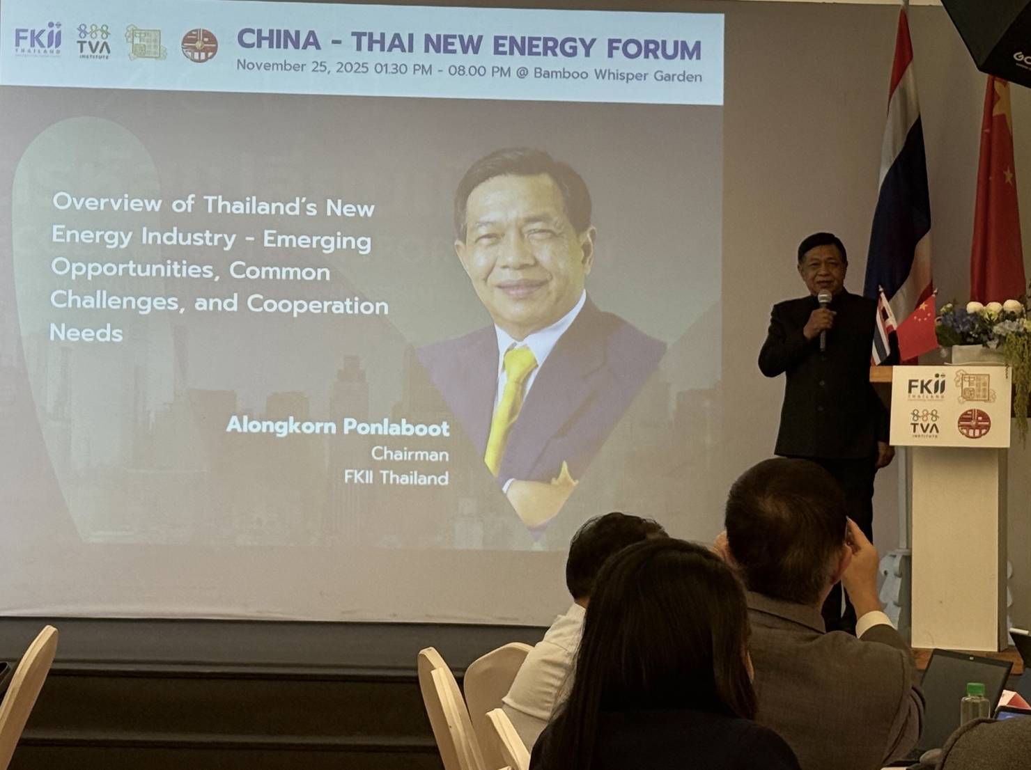 นายอลงกรณ์ พลบุตร ประธานสถาบัน FKII Thailandและผู้ก่อตั้งมูลนิธิสถาบันพลังงานทางเลือกแห่งประเทศไทย ผู้ได้รับฉายา"มิสเตอร์เอทานอล"กล่าวปาฐกถาพิเศษในฟอรั่ม"พลังงานใหม่ จีน-ไทย“(China-Thai New Energy Forum) ณ TVA Hall สวนเสียงไผ่ โดย TVA China Venture ในเครือ TVA Corporation (สถาบันทิวา) ภายใต้การนำของ คุณชยดิฐ หุตานุวัชร์ ประธาน TVA ซึ่งมุ่งผลักดันบทบาทของไทยในฐานะศูนย์กลางการลงทุนด้านพลังงานใหม่ของอาเซียน ผ่านเวทีการหารือเชิงลึกระหว่างภาคธุรกิจไทยและจีน ร่วมกับ New Energy Huangpu (ประเทศจีน) ที่มี Julia Zhu Lina เป็นประธาน โดยได้บรรลุข้อตกลงความร่วมมือระหว่างไทยและจีนในการเชื่อมโยงธุรกิจพลังงานแห่งอนาคต