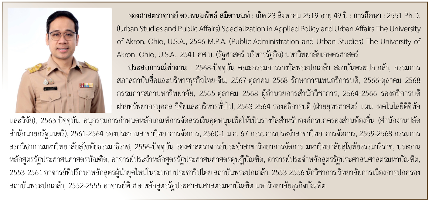 นั่นก็คือ รองศาสตราจารย์ ดร.พนมพัทธ์ สมิตานนท์ ซึ่งปัจจุบันท่าดำรงตำแหน่งเป็น อาจารย์ สาขาวิชาวิทยาการจัดการ มหาวิทยาลัย สุโขทัยธรรมาธิราช ในหลักสูตรรัฐประศาสน ศาสตรบัณฑิต วิชาเอกการบริหารการปกครอง ท้องที่ คณะกรรมการรางวัลพระปกเกล้า สถาบัน พระปกเกล้า ทั้งยังเคยดำรงตำแหน่ง รักษาการ อธิการบดี มหาวิทยาลัยสุโขทัยธรรมาธิราช (มสธ.) มาแล้ว และอาจารย์พนมพัทธ์ในวัย 49 ปี เริ่มเล่า รายละเอียดของชีวิตให้เราฟังว่า อาจารย์เติบโต ขึ้นในเขตกรุงเทพมหานคร โดยมีคุณพ่อคุณแม่ เป็นชาวเชียงใหม่ที่ได้ย้ายถิ่นฐานมาตั้งรกรากที่ กรุงเทพฯ คุณพ่อทำงานที่ธนาคารแห่งประเทศไทย ส่วนคุณแม่ก็เป็นแม่บ้าน มีพี่น้องทั้งหมดด้วย 3 คน เป็นผู้ชายทั้งหมด โดยอาจารย์ฯ เป็นลูกคนกลาง ชีวิตในวัยเด็กก็ไม่มีอะไรโลดโผนมากนัก การศึกษา ก็เริ่มเรียนตั้งแต่ชั้นประถมศึกษาถึงมัธยมศึกษา ตอนปลายที่โรงเรียนสาธิตเรียนสาธิตแห่ง มหาวิทยาลัยเกษตรศาสตร์ ซึ่งก็ไม่ลำบากเพราะ บ้านพักอาศัยก็อยู่ในไม่ไกลจากโรงเรียนมากนัก แค่ 3 ป้ายรถเมล์ ซึ่งแต่ก่อนแถวนี้เขาเรียก ทุ่ง บางเขน หลังจากจบมัธยมปลายที่สาธิตเกษตรฯ แล้ว ก็เข้าเรียนต่อได้ที่มหาวิทยาลัยเกษตรศาสตร์ คณะสังคมศาสตร์ ด้านรัฐประสาศนศาสตร์ หรือ บริหารรัฐกิจ