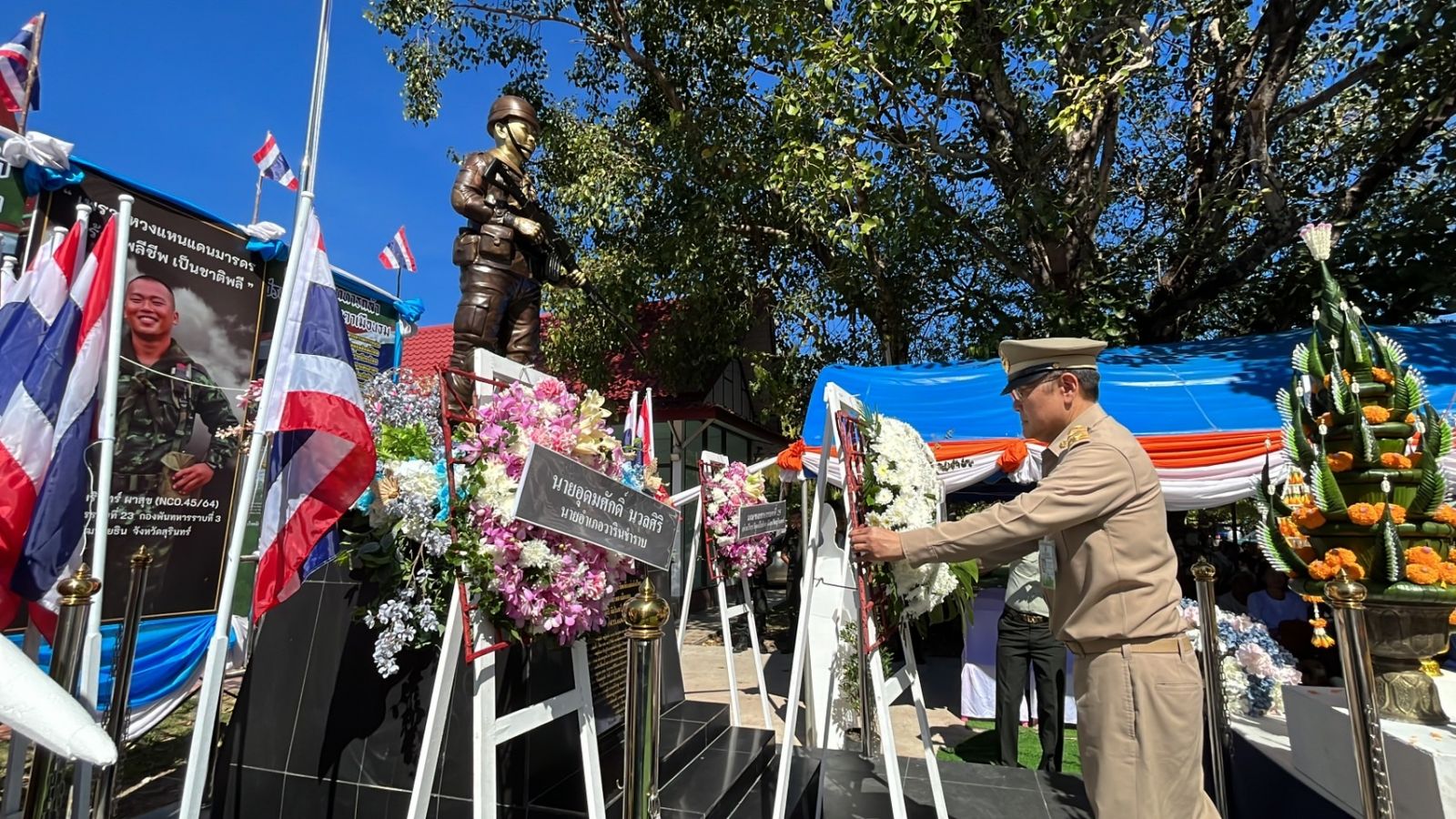 ครอบครัวทหารผู้กล้า และชาวบ้านทำบุญครบ 100 วัน ส.อ.อัมรินทร์ ผาสุก ตำแหน่งพลซุ่มยิง กองพันทหารราบที่ 3 กรมทหารราบที่ 23 กองพลทหารราบที่ 3 ซึ่งเสียชีวิตจากการปฏิบัติหน้าที่ในพื้นที่ปราสาทตาเมือน อ.พนมดงรัก จ.สุรินทร์ วันที่ 28 ก.ค.2568 พร้อมทำพิธีบวงสรวงอนุสาวรีย์ทหารผู้กล้า ซึ่งจัดสร้างให้รู้ว่าหมู่บ้านแห่งนี้ มีวีระบุรุษผู้กล้าที่ได้เสียสละเลือดเนื้อและชีวิตเข้าแลกเพื่อปกป้องพื้นแผ่นดินไทย