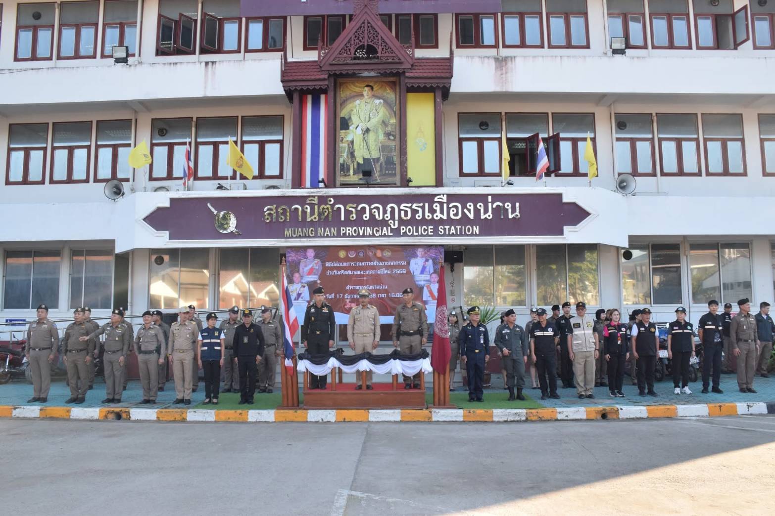 โดยมี พล.ต.ต.ดเรศ กัลยา ผู้บังคับการตำรวจภูธรจังหวัดน่าน พร้อมด้วยหัวหน้าส่วนราชการ หน่วยงานด้านความมั่นคง และภาคีเครือข่าย อาทิ ผู้บังคับฝูงบิน 466 น่าน ผู้กำกับการสถานีตำรวจในพื้นที่ หน่วยทหาร ฝ่ายปกครอง องค์กรปกครองส่วนท้องถิ่น หน่วยแพทย์ การศึกษา ตลอดจนเจ้าหน้าที่ตำรวจ ทหาร อาสาสมัครป้องกันภัยฝ่ายพลเรือน และจิตอาสา เข้าร่วมพิธีอย่างพร้อมเพรียง