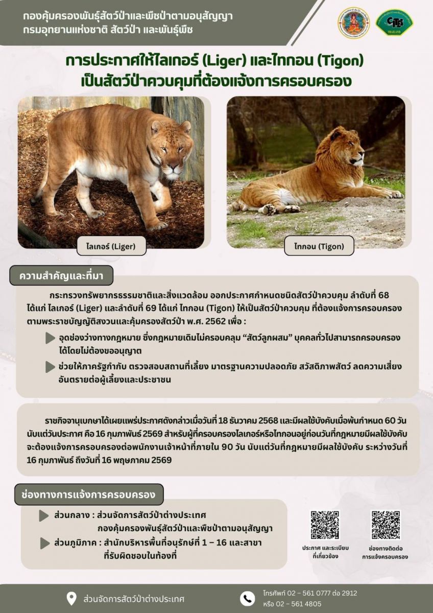 นายอรรถพล เจริญชันษา อธิบดีกรมอุทยานแห่งชาติ สัตว์ป่า และพันธุ์พืช เปิดเผยว่า กระทรวงทรัพยากรธรรมชาติและสิ่งแวดล้อมออกประกาศ เรื่อง กำหนดชนิดสัตว์ป่าควบคุมที่ต้องแจ้งการครอบครอง (ฉบับที่ 2) พ.ศ. 2568 ทั้งนี้ประกาศดังกล่าว ส่งผลให้ "ไลเกอร์” (Liger) และ “ไทกอน” (Tigon) สัตว์ลูกผสมจากการผสมข้ามสายพันธุ์ระหว่างสิงโตกับเสือโคร่ง ซึ่งตามนิยามเดิมไม่ได้ถูกจัดเป็นสัตว์ป่าคุ้มครองหรือสัตว์ป่าต่างประเทศที่ต้องแจ้งการครอบครอง ทำให้บุคคลทั่วไปสามารถครอบครองได้โดยไม่ต้องขออนุญาต และไม่มีมาตรการกำกับดูแลที่ชัดเจน ทำให้เกิดช่องว่างทางกฎหมาย ทั้งในด้านการเลี้ยงดู ความปลอดภัย และการตรวจสอบที่มาของสัตว์