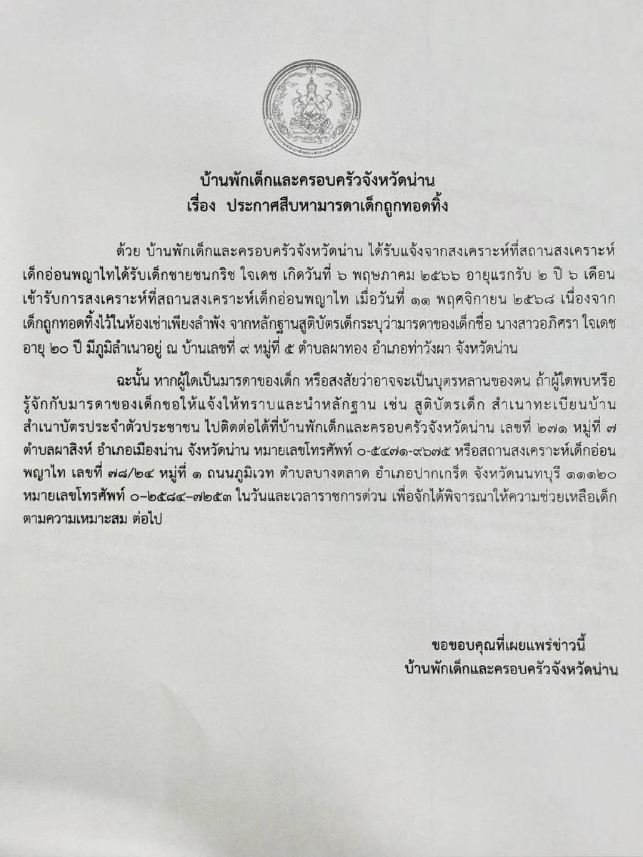 จึงขอความร่วมมือจากผู้ที่ทราบเบาะแส หรือสามารถติดต่อ นางสาวอภิศรา ใจเดช ได้
