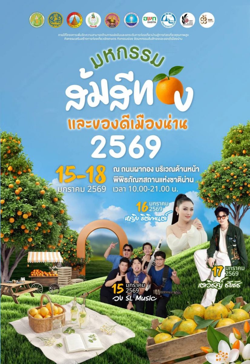 จังหวัดน่าน ขอเชิญประชาชนและนักท่องเที่ยวร่วมสัมผัสเสน่ห์วิถีชุมชนในงาน “มหกรรมส้มสีทองและของดีเมืองน่าน ประจำปี 2569” ระหว่างวันที่ 15 – 18 มกราคม 2569 ณ ถนนผากอง หน้า พิพิธภัณฑสถานแห่งชาติน่าน