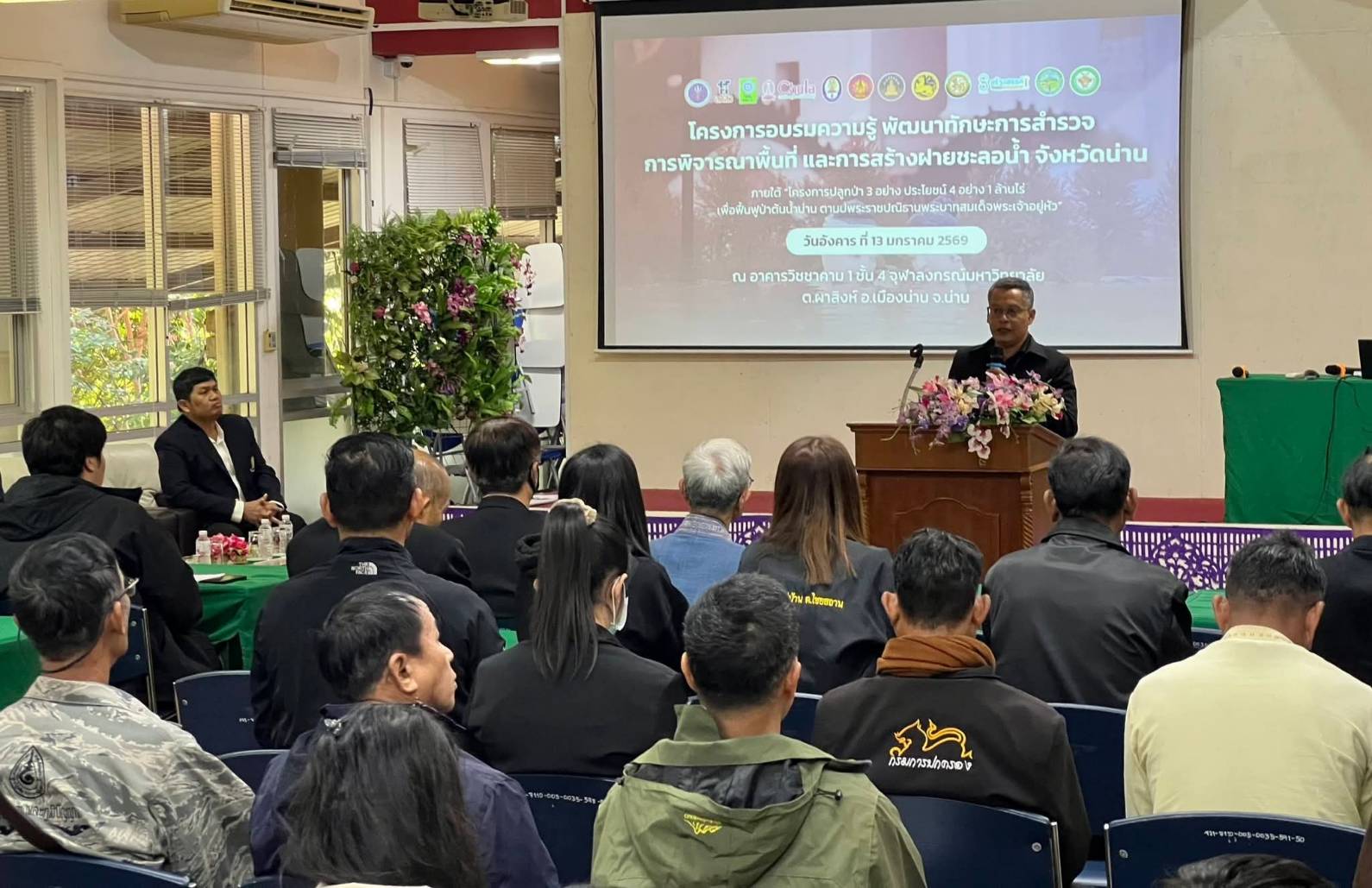 เมื่อวันที่ 13 มกราคม 2569 ณ อาคารวิชชาคาม 1 ศูนย์เครือข่ายการเรียนรู้เพื่อภูมิภาค จุฬาลงกรณ์มหาวิทยาลัย อำเภอเมืองน่าน จังหวัดน่าน โดยนายชัยนรงค์ วงศ์ใหญ่ ผู้ว่าราชการจังหวัดน่าน มอบหมายให้ นายบรรจง ขุนเพชร รองผู้ว่าราชการจังหวัดน่าน เป็นประธานเปิดการอบรม “ความรู้และทักษะการสำรวจและพิจารณากำหนดสถานที่และการสร้างฝายชะลอน้ำ” ภายใต้โครงการสร้างฝายชะลอน้ำจังหวัดน่าน เดินหน้าขับเคลื่อนโครงการ “ปลูกป่า 3 อย่าง ประโยชน์ 4 อย่าง” เพื่อฟื้นฟูระบบนิเวศป่าต้นน้ำอย่างยั่งยืน การจัดอบรมครั้งนี้เป็นส่วนหนึ่งของการสานต่อพระราชปณิธานของพระบาทสมเด็จพระเจ้าอยู่หัว ในการฟื้นฟูความอุดมสมบูรณ์ของป่าต้นน้ำจังหวัดน่าน ซึ่งเป็นแหล่งกำเนิดของแม่น้ำน่าน ที่หล่อเลี้ยงประชาชนจำนวนมากในพื้นที่ลุ่มน้ำเจ้าพระยา โดยนำหลักการ “ปลูกป่า 3 อย่าง ประโยชน์ 4 อย่าง” มาปรับใช้ เพื่อให้คนกับป่าสามารถอยู่ร่วมกันได้อย่างสมดุลและยั่งยืน