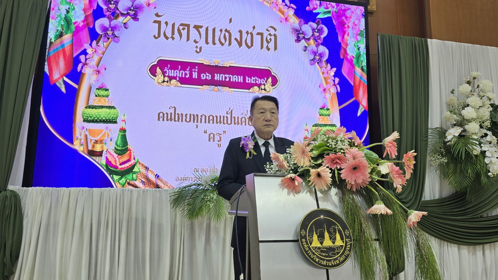นายวสันต์ (นายกเปี๊ยก) ภูษิตกาญจนา นายกเทศมนตรีเมืองกาญจนบุรี ประธานในพิธีฯ เปิดเผยว่า ผมรู้สึกเป็นเกียรติและยินดีเป็นอย่างยิ่งที่ได้มีโอกาสต้อนรับ "แม่พิมพ์ของชาติ" ผู้ทรงเกียรติทุกท่าน เข้าสู่ โครงการจัดงานวันครู ประจำปี ๒๕๖๙ ห้องบุษราคัมชั้น ๑ ขององค์การบริหารส่วนจังหวัดกาญจนบุรี แห่งนี้ วันครู ๑๖ มกราคม เป็นวันที่มีความหมายลึกซึ้งต่อพวกเราชาวท้องถิ่น เพราะ "ครู อปท." คือฟันเฟืองสำคัญที่สุดในการขับเคลื่อนยุทธศาสตร์จังหวัดกาญจนบุรี ด้านการพัฒนาคุณภาพชีวิตประชาชนในทุกมิติ และการสืบสานด้านศาสนา ศิลปะ วัฒนธรรมให้ดำรงคงอยู่คู่แผ่นดินไทย การดำเนินงานในวันวันนี้เกิดจากความตั้งใจเชิดชูบทบาทของครู ท่ามกลางสังคมเปลี่ยนแปลงไปอย่างรวดเร็ว แม้เทคโนโลยีจะก้าวล้ำเพียงใด แต่ "หัวใจของความเป็นครู" ที่เปี่ยมด้วยความเมตตา ทักษะการอบรมสั่งสอน และการเป็นแบบอย่างที่ดี ตามจรรยาบรรณวิชาชีพ ยังคงเป็นสิ่งสำคัญที่สุดในการหล่อหลอมให้เด็กและเยาวชนเติบโตเป็นพลเมืองที่สมบูรณ์ ในโอกาสอันเป็นมงคลนี้ ผมขอเน้นย้ำความสำคัญใน ๓ ประเด็นหลัก คือ ๑. การสร้างคน สร้างเมือง การที่ท่านทุ่มเทสอนศิษย์ให้เป็นคนดีมีความรู้ เท่ากับว่าท่านกำลังช่วยกันสร้างอนาคตของจังหวัดกาญจนบุรี ให้มีความเข้มแข็งและยั่งยืน ๒. การสานสัมพันธ์ภาคีเครือข่าย ผมหวังว่ากิจกรรมในวันนี้จะเป็นพื้นที่ให้ครูจากหลายสังกัดในองค์กรปกครองส่วนท้องถิ่น ได้เชื่อมสัมพันธ์ แลกเปลี่ยนเรียนรู้ และสร้างพลังความสามัคคีร่วมกัน ๓. การเชิดชูผู้เสียสละ