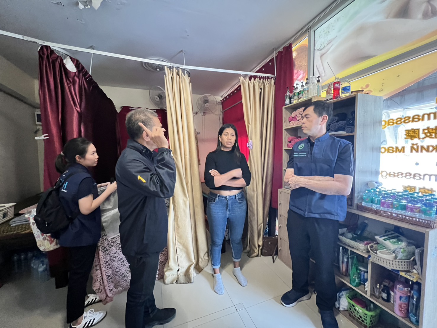 ร้านแรกพบหญิงอายุ 25 ปี แสดงตัวเป็นผู้ดูแลร้าน ภายในมีเตียงนวดหลายจุดและอุปกรณ์ครบชุด ขณะเข้าตรวจค้นพบลูกค้ากำลังนั่งรับบริการ โดยหนึ่งในหมอนวดกำลังให้บริการกับเจ้าหน้าที่ตำรวจที่แฝงตัวมาเป็นลูกค้า เจ้าหน้าที่จึงแสดงตัว สั่งหยุดให้บริการทันที พร้อมบันทึกภาพเป็นหลักฐาน และตรวจยึดอุปกรณ์ทั้งหมด ทั้งน้ำมันนวด ยาหม่อง และเครื่องมือที่ใช้ในกิจการ