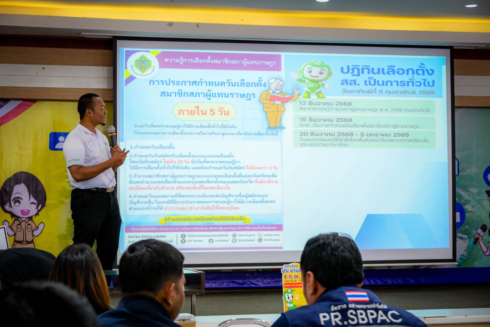 จากนั้น นายปิยะวุธ เขียวขำ ได้บรรยายให้ความรู้เพื่อสร้างความเข้าใจที่ถูกต้องเกี่ยวกับการเลือกตั้งและการออกเสียงประชามติในประเด็นสำคัญ อาทิ พระราชกฤษฎีกายุบสภาผู้แทนราษฎร พ.ศ. 2568 และประกาศคณะกรรมการการเลือกตั้งที่เกี่ยวข้อง แนวทางการวินิจฉัยสิทธิสมัครรับเลือกตั้งสมาชิกสภาผู้แทนราษฎร รายชื่อพรรคการเมืองที่ยื่นบัญชีรายชื่อผู้สมัครรับเลือกตั้งแบบบัญชีรายชื่อ และรายชื่อบุคคลที่พรรคการเมืองเสนอเป็นนายกรัฐมนตรี รวมถึงการลงทะเบียนขอใช้สิทธิเลือกตั้งล่วงหน้า แนวทางการปฏิบัติและข้อควรระวังในช่วงการหาเสียงเลือกตั้งของผู้สมัคร พรรคการเมือง ผู้ดำรงตำแหน่งทางการเมือง และหน่วยงานของรัฐ ตลอดจนที่มาและเหตุผลความจำเป็นของการออกเสียงประชามติ แผนการจัดการออกเสียงประชามติในวันเดียวกับวันเลือกตั้ง และขั้นตอนการใช้สิทธิเลือกตั้งควบคู่การออกเสียงประชามติ เพื่อให้ประชาชนสามารถใช้สิทธิได้อย่างถูกต้องและเข้าใจ