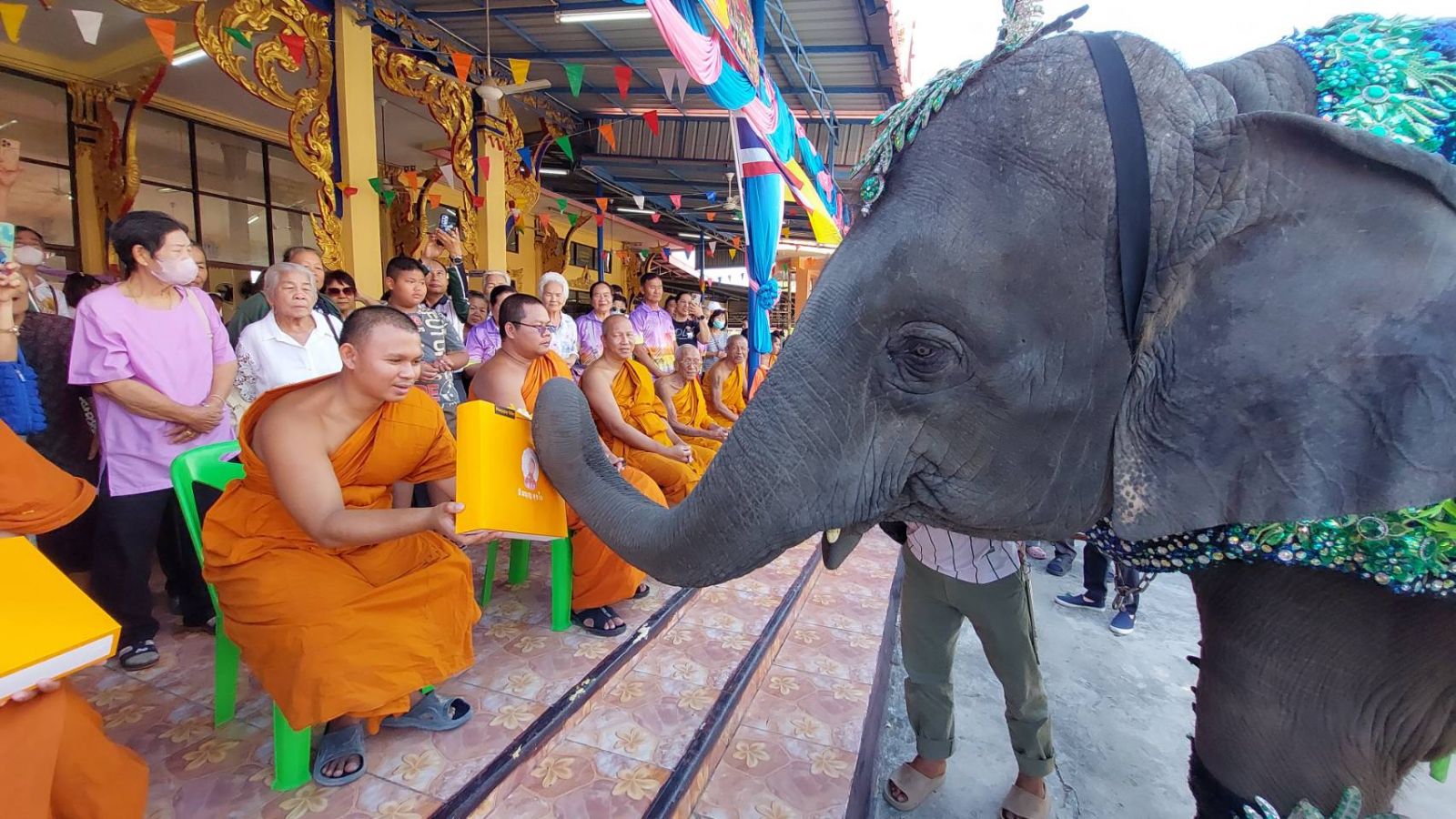 โดยการนำช้างจำนวน 3 เชือก ประกอบด้วยช้างพลายบัวบาน พังชื่นใจ และพังสมบูรณ์ หรือน้องนาโน จากซุ้มหลังคาเขียว จากหมู่บ้านช้าง บ้านตากลาง อำเภอท่าตูม จังหวัดสุรินทร์ มาร่วมพิธีตักบาตรพระ พร้อมกับช้างร่วมตักบาตรพระในตอนเช้า โดยโชว์ความน่ารักและความสามารถในการใส่บาตรพระได้อย่างเป็นอย่างดี สร้างความฮือฮาให้กับประชาชน และกลุ่ม FC บัวบาน ที่เข้าร่วมในพิธีเป็นอย่างมาก โดยจัดให้มีพิธีไหว้ครูหมอช้าง ที่ชาวจังหวัดสุรินทร์เรียกว่า พิธีปะกำ หรือ แซนปะกำ คือพิธีกรรมศักดิ์สิทธิ์ที่สำคัญที่สุดของชาวกูย (หรือกวย) ในจังหวัดสุรินทร์ เพื่อบวงสรวง "ผีปะกำ" หรือดวงวิญญาณบรรพบุรุษผู้เป็นหมอช้าง ผ่านเชือกปะกำที่ทำจากหนังควาย สะท้อนถึงความเชื่อเรื่องการดูแลรักษา ปกป้อง และความผูกพันที่มองช้างเป็นสมาชิกในครอบครัว มากกว่าแค่สัตว์เลี้ยงหรือสัตว์ใช้งานทั่วไป และการแสดงโชว์ของช้างบัวบาน ช้างชื่นใจ และช้างนาโน ที่เป็นขวัญใจของเด็กๆ และประชาชนที่มาร่วมงาน สามารถจับต้องและสัมผัสถ่ายภาพช้างได้อย่างใกล้ชิด รวมถึงการประกอบโรงทานเลี้ยงอาหารให้กับประชาชนและพุทธศาสนิกชนได้อิ่มหนำกันอย่างจุใจเลยทีเดียว