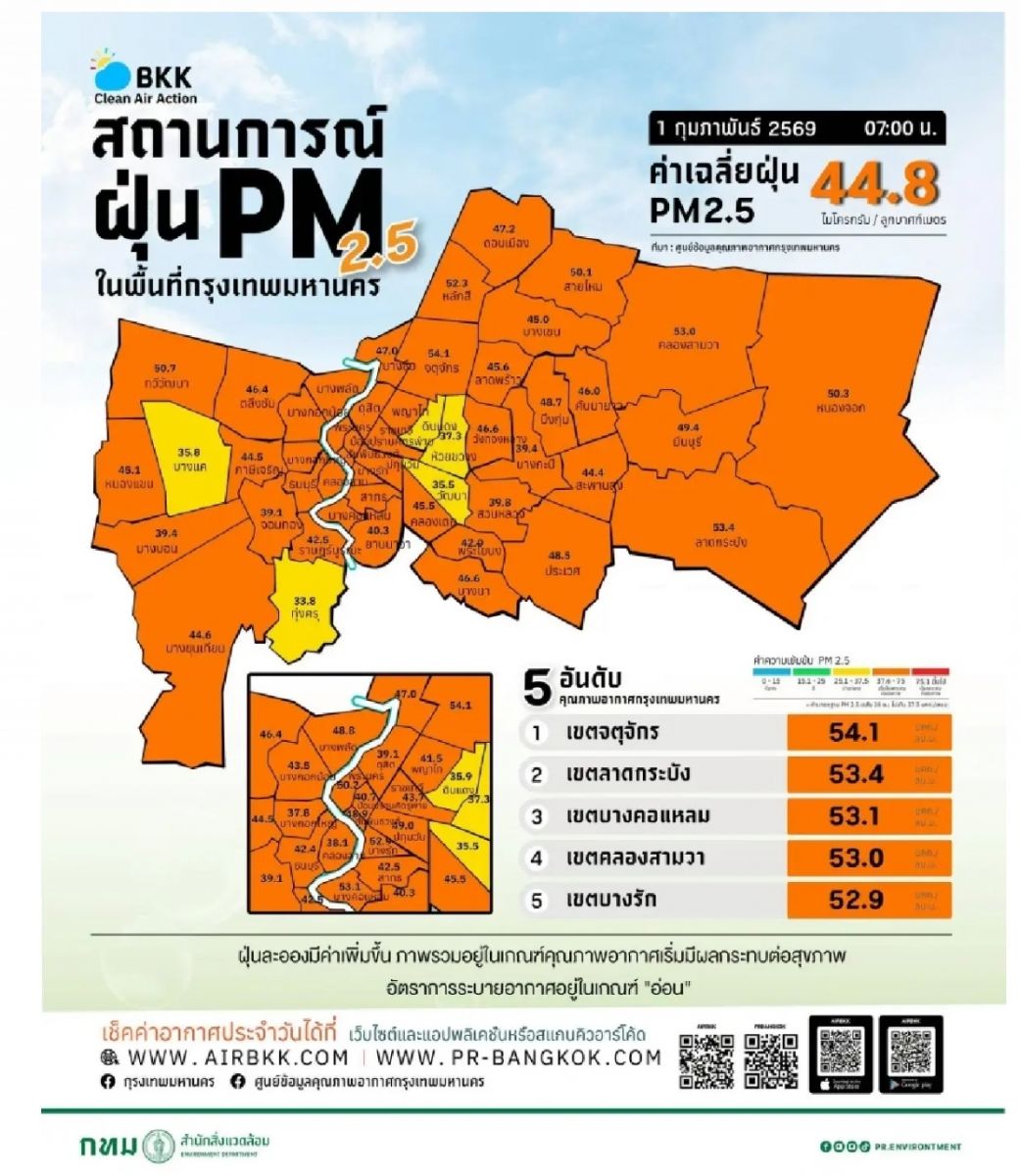 ศูนย์ข้อมูลคุณภาพอากาศกรุงเทพมหานคร รายงานสถานการณ์ฝุ่นละอองขนาดไม่เกิน 2.5 ไมครอน (PM 2.5) ในกรุงเทพมหานคร ประจำวันที่ 1 กุมภาพันธ์ 2569 เวลา 07:00 น.