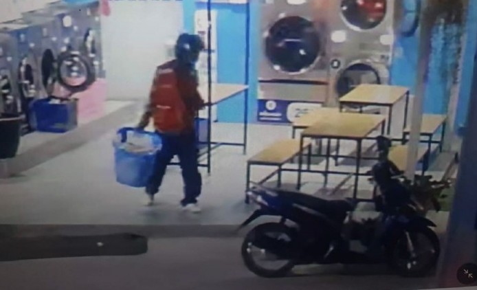 จากนั้นคนร้ายเปิดฝาเครื่องอบ หยิบเสื้อผ้าทั้งหมดของผู้เสียหายใส่ลงในตะกร้าสีเขียว ก่อนจะนำเสื้อผ้าที่ตนเองถือมาใส่เข้าไปในเครื่องอบแห้งโดยไม่หยอดเหรียญให้เครื่องทำงาน แล้วหอบตะกร้าของผู้เสียหายเดินออกจากร้านไปอย่างใจเย็น ก่อนขึ้นรถจักรยานยนต์ฮอนด้าคลิกสีน้ำเงิน ซึ่งจอดอยู่หน้าร้าน ไม่ทราบหมายเลขทะเบียน หลบหนีไป