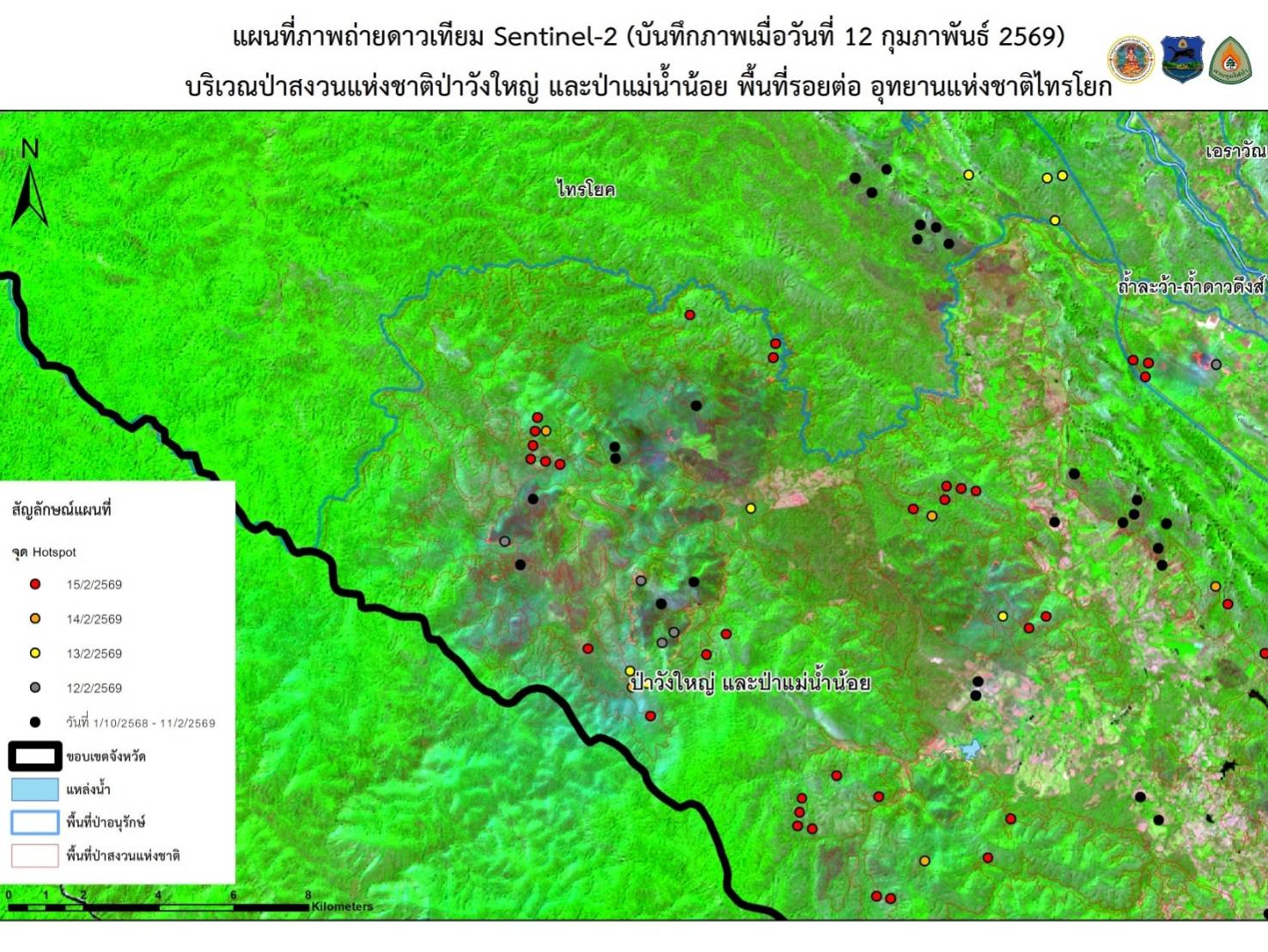 ผู้สื่อข่าวรายงานว่า เมื่อวันที่ 15 ก.พ.69 ที่ผ่านมา นายมานะ เพิ่มพูล ผู้อำนวยการส่วนควบคุมไฟป่า (สคฟ.) สำนักป้องกัน ปราบปราม และควบคุมไฟป่า กรมอุทยานแห่งชาติ สัตว์ป่า และพันธุ์พืช เปิดเผยถึงสถานการณ์ไฟป่าในพื้นที่จังหวัดกาญจนบุรี โดยนายพีร พวงมาลี หัวหน้าอุทยานแห่งชาติไทรโยค ได้จัดทำรายงานสถานการณ์ ระบุว่า จากการเฝ้าระวังอย่างใกล้ชิด กลุ่มไฟกระจายตัวเป็นจำนวนมาก โดยเฉพาะในเขตป่าสงวนแห่งชาติป่าวังใหญ่และป่าแม่น้ำน้อย ซึ่งเป็นพื้นที่รอยต่อสำคัญระหว่างอุทยานแห่งชาติไทรโยค สวนป่าองค์การอุตสาหกรรมป่าไม้ (สวนป่าไทรโยค) และชายแดนสาธารณรัฐแห่งสหภาพเมียนมา ในกลุ่มป่าที่ 12 (รอบเขื่อนศรีนครินทร์) ซึ่งพบทิศทางไฟกำลังลุกลามมุ่งหน้าเข้าสู่อุทยานแห่งชาติไทรโยค บริเวณเขาปลาน้อย เขาพลู และพื้นที่เหมืองเต่าดำอย่างน่ากังวล