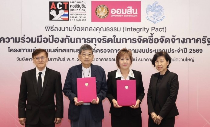 ซึ่งเป็นความร่วมมือป้องกันการทุจริตในการจัดซื้อจัดจ้างภาครัฐ ตามยุทธศาสตร์ในการป้องกันและปราบปรามการทุจริตคอร์รัปชันอย่างยั่งยืนของรัฐบาล ที่มีนโยบายส่งเสริมการบริหารงานที่มีธรรมาภิบาล และการป้องกันปราบปรามการทุจริตและประพฤติมิชอบในภาครัฐที่สร้างความไม่เป็นธรรมและเหลื่อมล้ำในสังคม สำหรับโครงการที่มีวงเงินจัดซื้อจัดจ้างตั้งแต่ 1,000 ล้านบาทขึ้นไป สอดคล้องกับการดำเนินการด้วยหลักธรรมาภิบาลของธนาคาร ที่ให้ความสำคัญในการบริหารจัดการงบประมาณ และทรัพยากรของธนาคาร ด้วยความรอบคอบ โปร่งใส และเกิดประโยชน์สูงสุด มีกระบวนการทำงานที่มีความสุจริต เที่ยงธรรม ตรวจสอบได้ในทุกขั้นตอน และเปิดโอกาสให้ภาคเอกชนเข้าแข่งขันอย่างเท่าเทียม โดยมี นายชาญเชพ ชินบานทอง ผู้ช่วยผู้อำนวยการธนาคารออมสิน สายงานบริหารงานกลาง กลุ่มปฎิบัติการ ร่วมเป็นสักขีพยาน ณ อาคารออมสินพิพัฒน์ ธนาคารออมสิน สำนักงานใหญ่ เมื่อวันที่ 17 กุมภาพันธ์ 2569