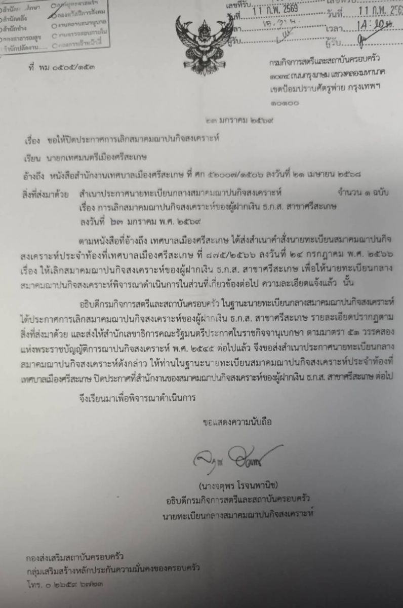 เมื่อวันที่ 19 ก.พ. 2569 นายฉัฐมงคล อังคสกุลเกียรติ นายกเทศมนตรีเมืองศรีสะเกษ กล่าวว่า ตามที่มีกระแสข่าวปรากฏในโซเชี่ยลประเด็นยกเลิกสมาคมฌาปณกิจสงเคราะห์ผู้ฝากเงิน ธ.ก.ส. สาขาศรีสะเกษ จนมีกระแสวิพากษ์วิจารย์กันไปต่างๆนานา นั้น ตนอยากเรียนชี้แจงว่า ปัจจุบันในเขตเทศบาลเมืองศรีสะเกษ มีสมาคมฌาปณกิจสงเคราะห์ฯ ที่อยู่ในความดูแลของเทศบาลเมืองศรีสะเกษ ในฐานะนายทะเบียนท้องที่ จำนวน 8 แห่ง ซึ่งสมาคมฌาปณกิจสงเคราะห์ผู้ฝากเงิน ธ.ก.ส. สาขาศรีสะเกษ มีคำสั่งยกเลิกไปเพียงแห่งเดียว ไม่ใช่ยกเลิกทั้งหมด