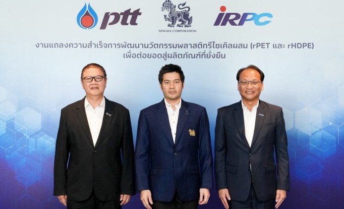 โดยมี นายปิติ ภิรมย์ภักดี กรรมการรองกรรมการผู้จัดการใหญ่อาวุโส และ ประธานเจ้าหน้าที่บริหาร กลุ่มบริษัทผลิต บริษัท บุญรอดบริวเวอรี่ จำกัด นายประสงค์ อินทรหนองไผ่ ประธานเจ้าหน้าที่ปฏิบัติการกลุ่มธุรกิจปิโตรเลียมขั้นปลาย บริษัท ปตท. จำกัด (มหาชน) และ นายเทอดเกียรติ พร้อมมูล ประธานเจ้าหน้าที่บริหารและกรรมการผู้จัดการใหญ่ บริษัท ไออาร์พีซี จำกัด (มหาชน) ร่วมแถลงความสำเร็จการพัฒนานวัตกรรมพลาสติกรีไซเคิลผสม (rPET และ rHDPE) ต่อยอดสู่การสร้างผลิตภัณฑ์ที่ยั่งยืน