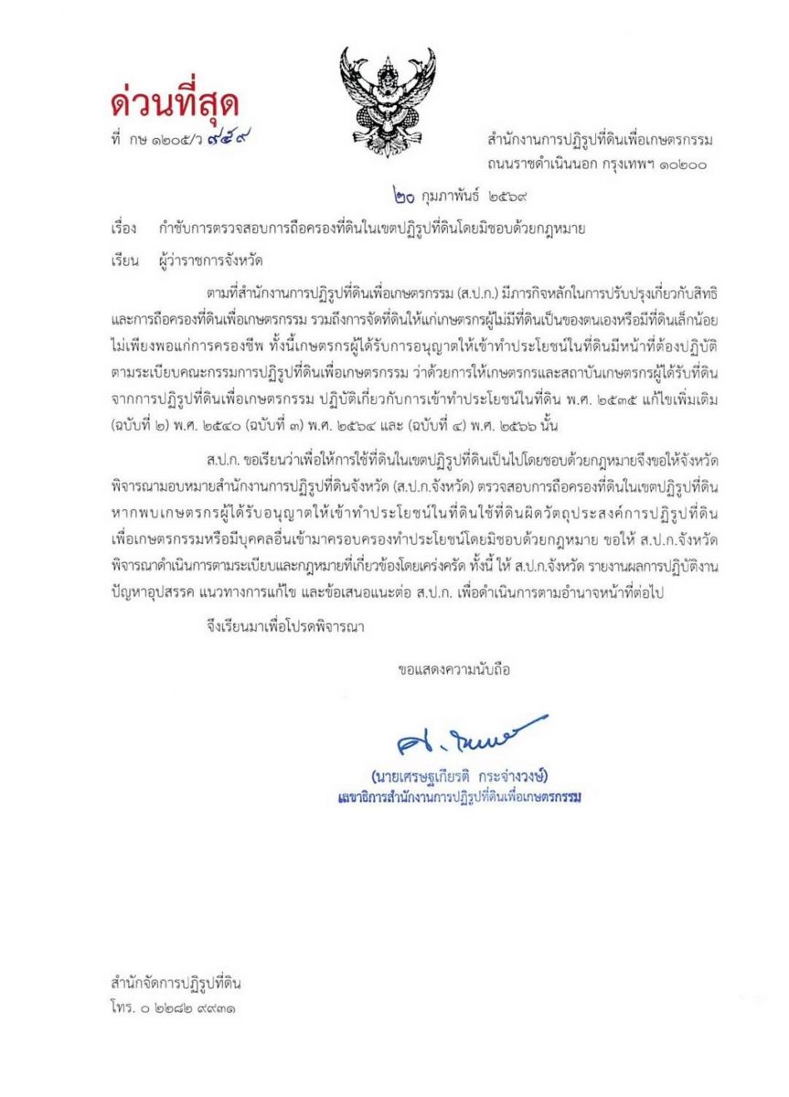 ผู้สื่อข่าวรายงานว่า เมื่อวันที่ 20 ก.พ.69 ที่ผ่านมา นายเศรษฐเกียรติ กระจ่างวงษ์ เลขาธิการสำนักงานการปฏิรูปที่ดินเพื่อเกษตรกรรม ได้ลงนามในหนังสือด่วนที่สุด ที่ กษ 1205/ว959 ถึงผู้ว่าราชการจังหวัด เรื่อง กำชับการตรวจสอบการถือครองที่ดินในในเขตปฏิรูปที่ดินโดยมิชอบด้ายกฎหมาย
