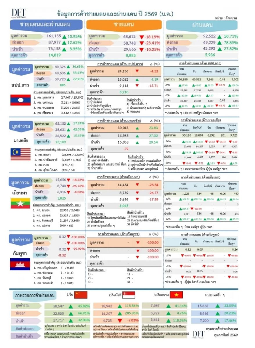 การค้าชายแดนกับประเทศเพื่อนบ้าน 4 ประเทศ เดือนมกราคม 2569 มีมูลค่าการค้ารวม 68,613 ล้านบาท (-18.2%) เป็นการส่งออก 38,748 ล้านบาท (-23.4%) การนำเข้า 29,865 ล้านบาท (-10.3%) และไทยได้ดุลการค้ารวมทั้งสิ้น 8,883 ล้านบาท โดยการค้าชายแดนกับมาเลเซียมีมูลค่าสูงสุด 30,043 ล้านบาท รองลงมา คือ สปป.ลาว 24,136 ล้านบาท และเมียนมา 14,434 ล้านบาท ในขณะที่การค้าชายแดนไทย-กัมพูชา เป็น 0 (-100%) ซึ่งสินค้าส่งออกชายแดนสำคัญในเดือนมกราคม 2569 ได้แก่ น้ำมันดีเซล 3,652 ล้านบาท แผงวงจรไฟฟ้า 1,232 ล้านบาท และน้ำมันสำเร็จรูปอื่นๆ 1,214 ล้านบาท