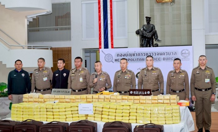 วันที่ 16 มีนาคม 2569 ที่กองบัญชาการตำรวจนครบาล พล.ต.อ.สำราญ นวลมา รองผู้บัญชาการตำรวจแห่งชาติ พร้อมด้วย พล.ต.ท.สยาม บุญสม ผู้บัญชาการตำรวจนครบาล พล.ต.ต.ธีรเดช ธรรมสุธีร์ และ พ.ต.อ.วิชัย สนสกุล ผู้กำกับการสืบสวน กองบังคับการตำรวจนครบาล 1 ร่วมกันแถลงผลการทลายเครือข่ายค้ายาเสพติดรายใหญ่ ที่ลักลอบลำเลียงยาเสพติดเพื่อเตรียมกระจายจำหน่ายในพื้นที่กรุงเทพมหานครชั้นใน