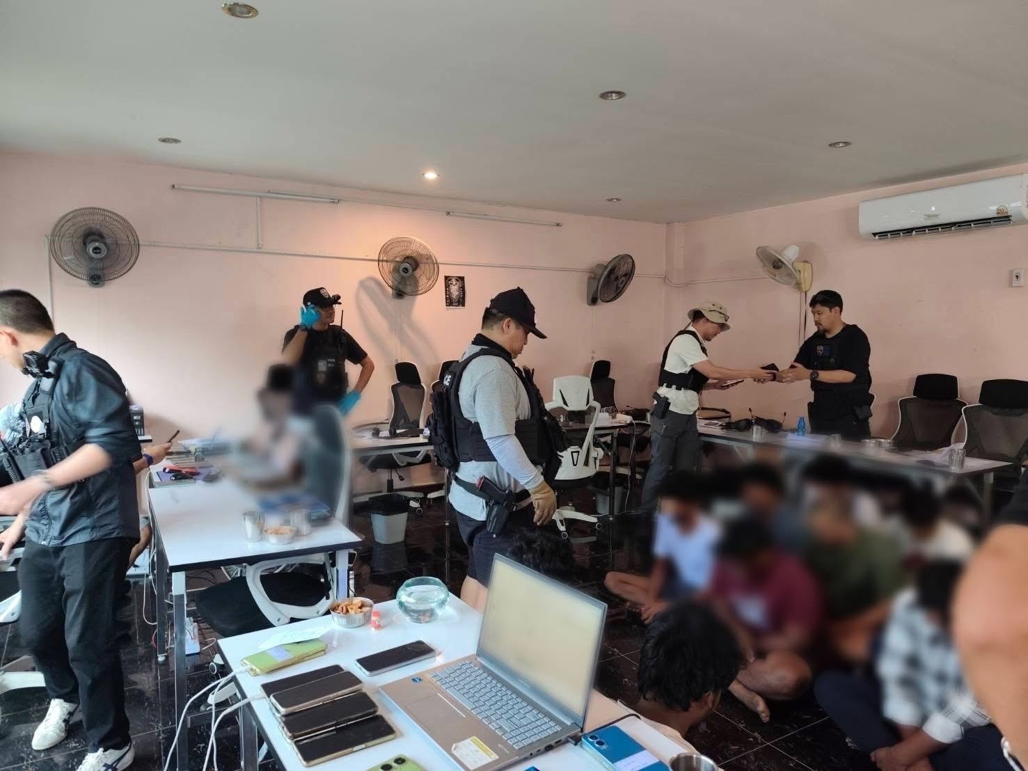 เมื่อเจ้าหน้าที่บุกเข้าไปค้น ภายใน พบชาวต่างชาติ สัญชาติอินเดีย รวม 25 ราย กำลังแยกปฏิบัติหน้าที่ เป็นผู้จัดการการตลาด บัญชี และแอดมินดูแลลูกค้า โดยมีการกักตัวพนักงานไว้ภายในบ้าน ใช้เครื่องปั่นไฟและเตรียมอาหารแช่แข็งไว้ สำหรับประกอบอาหารภายในบ้าน เพื่อหลีกเลี่ยงการเดินทางออกนอกพื้นที่ให้ถูกสังเกตเห็น