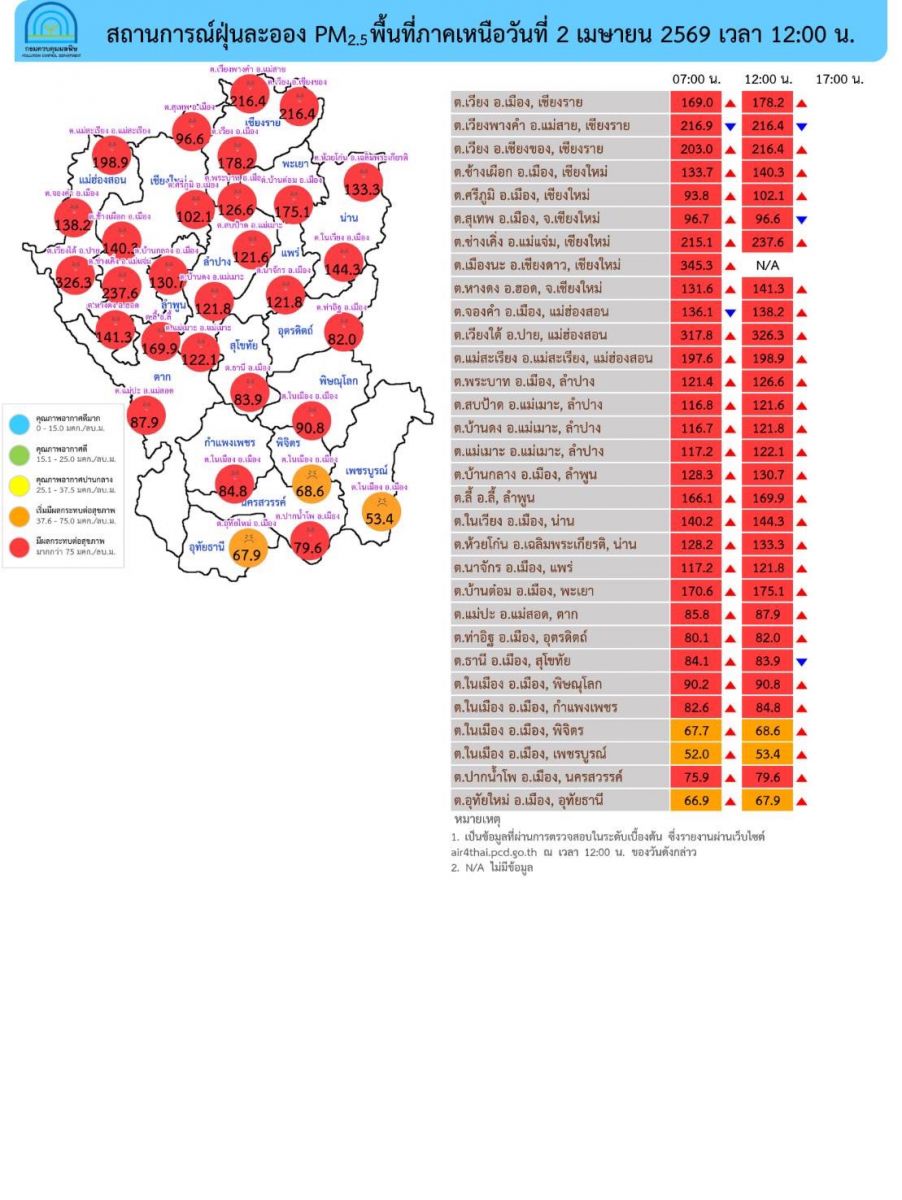 ศูนย์สื่อสารการแก้ไขปัญหามลพิษทางอากาศ (ศกพ.) กรมควบคุมมลพิษ รายงานคุณภาพอากาศประจำวันที่ 2 เมษายน 2569 ณ 12:00 น. ภาพรวมสถานการณ์ฝุ่นละอองขนาดเล็ก PM2.5 ในประเทศ พบว่ายังคงมีค่าสูงในหลายพื้นที่ โดยเฉพาะบริเวณภาคเหนือและภาคตะวันออกเฉียงเหนือ โดยภาคเหนือพบค่าฝุ่นละอองระดับสีแดง ในหลายจังหวัด ได้แก่ เชียงราย เชียงใหม่ แม่ฮ่องสอน ลำปาง ลำพูน น่าน แพร่ พะเยา ตาก อุตรดิตถ์ สุโขทัย พิษณุโลก กำแพงเพชร และนครสวรรค์ ขณะที่ภาคตะวันออกเฉียงเหนือส่วนใหญ่อยู่ในระดับสีส้ม โดยมีบางพื้นที่อยู่ในระดับสีแดง ได้แก่ หนองคาย บึงกาฬ นครพนม และอุบลราชธานี