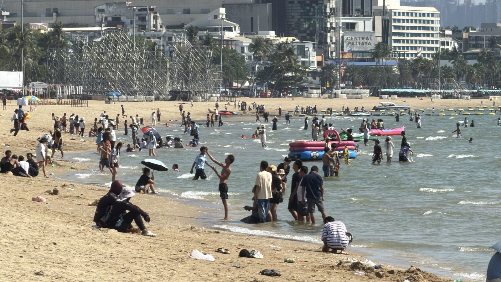 วันที่ 13 เมษายน 2569 ผู้สื่อข่าวลงพื้นที่บริเวณชายหาดเมืองพัทยา จ.ชลบุรี พบว่าบรรยากาศวันหยุดเทศกาลสงกรานต์เป็นไปอย่างคึกคัก มีประชาชนและนักท่องเที่ยวทั้งชาวไทยและชาวต่างชาติเดินทางเข้ามาพักผ่อนเป็นจำนวนมาก ต่างพากันจับจองเตียงผ้าใบ นอนพักผ่อนรับลมทะเล และลงเล่นน้ำคลายร้อนกันอย่างต่อเนื่อง