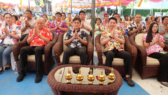 ภายในงานมีการจัดพิธีเจริญพระพุทธมนต์ เพื่อความเป็นสิริมงคล พร้อมพิธีตักบาตรข้าวสารอาหารแห้งแด่พระภิกษุสงฆ์จากวัดจิตตภาวันวิทยาลัย จากนั้นเป็นพิธีสรงน้ำพระพุทธรูป และพิธีรดน้ำขอพรผู้สูงอายุ เพื่อแสดงถึงความเคารพและสืบสานขนบธรรมเนียมประเพณีไทย