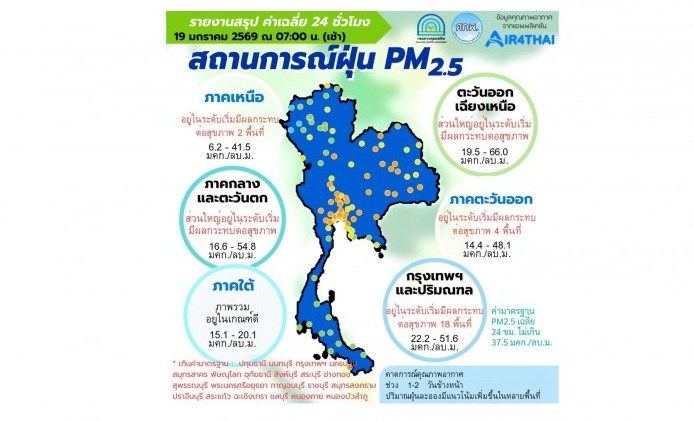 ศูนย์สื่อสารการแก้ไขปัญหามลพิษทางอากาศ (ศกพ.) กรมควบคุมมลพิษ รายงานการติดตามตรวจสอบคุณภาพอากาศ ประจำวันที่ 19 มกราคม 2569 ณ 07:00 น ภาพรวมปริมาณ PM2.5 ในประเทศพบเกินค่ามาตรฐาน 31 จังหวัด ได้แก่ จ.ปทุมธานี จ.นนทบุรี กรุงเทพฯ จ.นครปฐม จ.สมุทรสาคร จ.พิษณุโลก จ.อุ...