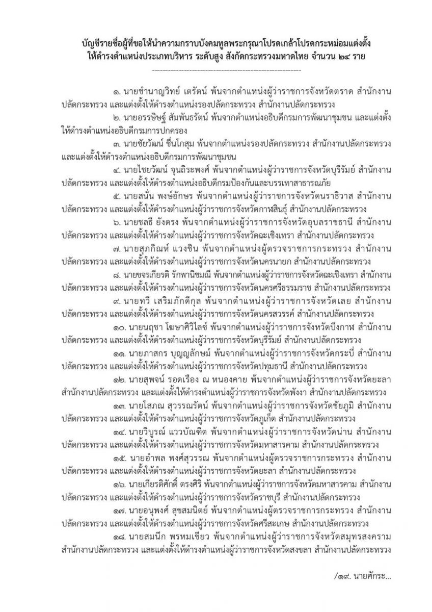17. นายอนุพงศ์ สุขสมนิตย์ พ้นจากตำแหน่งผู้ตรวจราชการกระทรวง สำนักงานปลัดกระทรวง และแต่งตั้งให้ดำรงตำแหน่งผู้ว่าราชการจังหวัดศรีสะเกษ สำนักงานปลัดกระทรวง